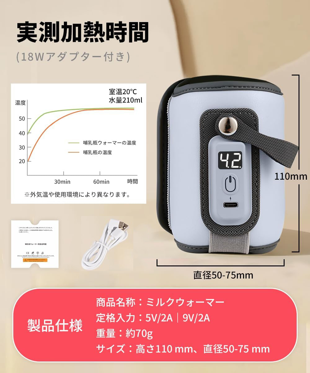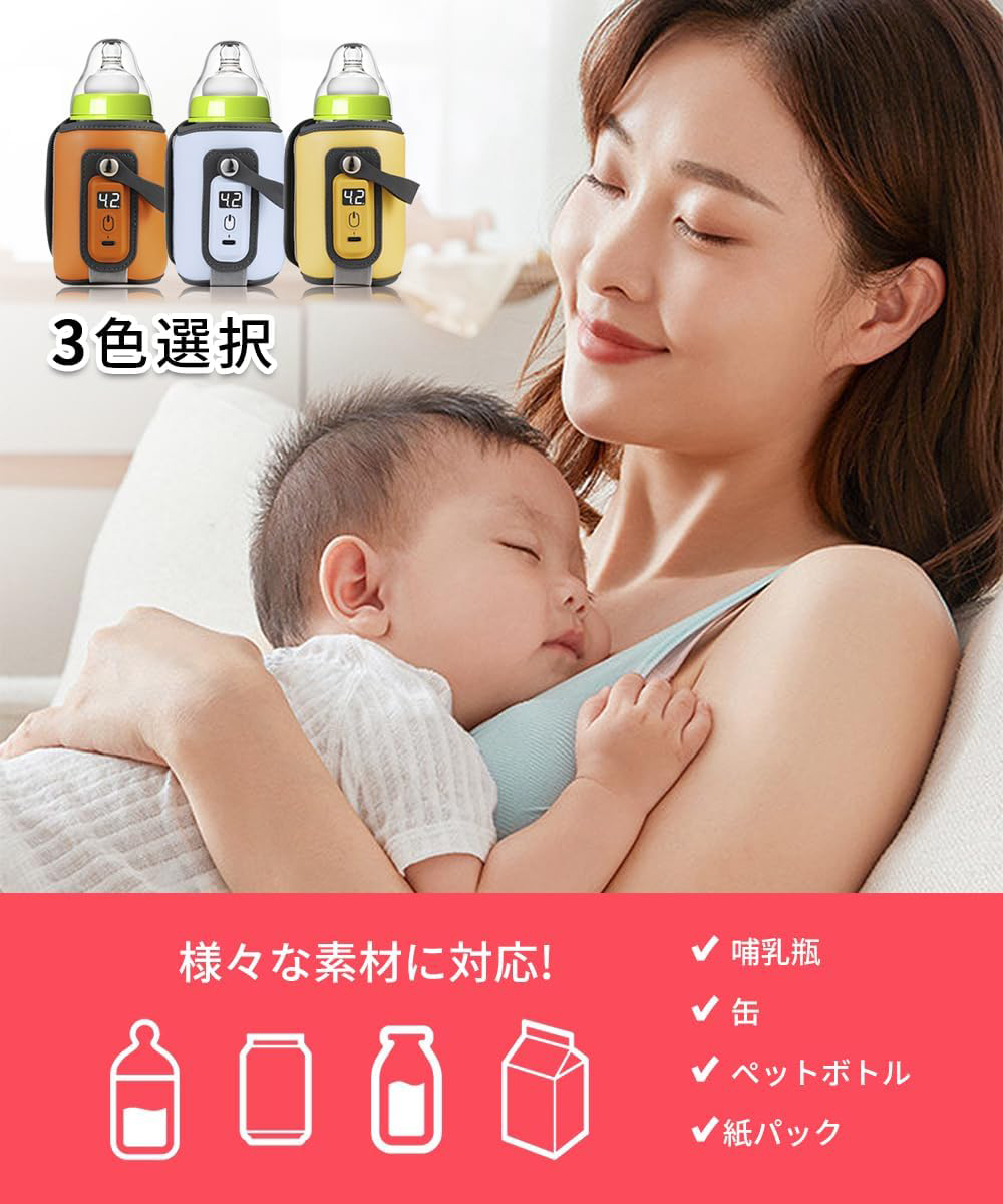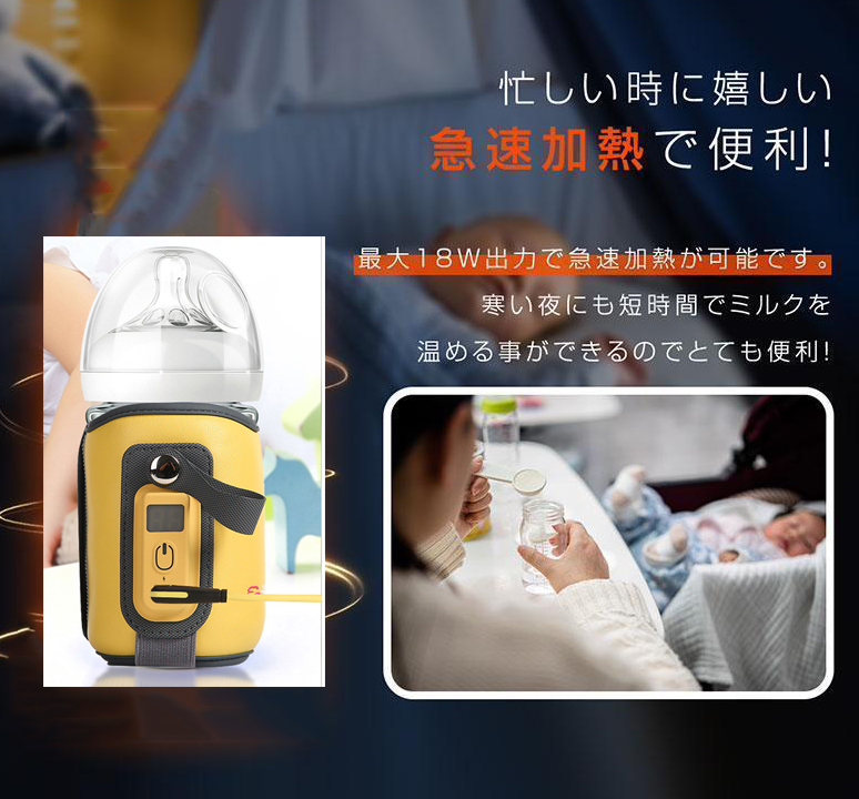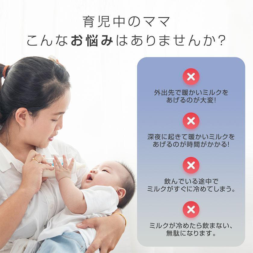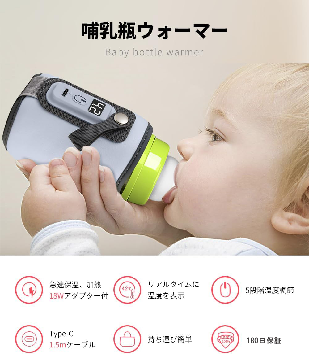【リアルタイムに温度を表示&使用説明】液晶ディスプレイにより、ミルクの温度を簡単に確認できます。赤ちゃんはいつも適温のミルクを飲むことができ、冷たすぎたり熱すぎたりすることはありません。本製品にはオンボタンがなく、ケーブルを接続すると自動的に電源が入ります。3秒間長押しして電源を切ります。※再起動の場合は、ケーブルを抜き差しする必要があります。