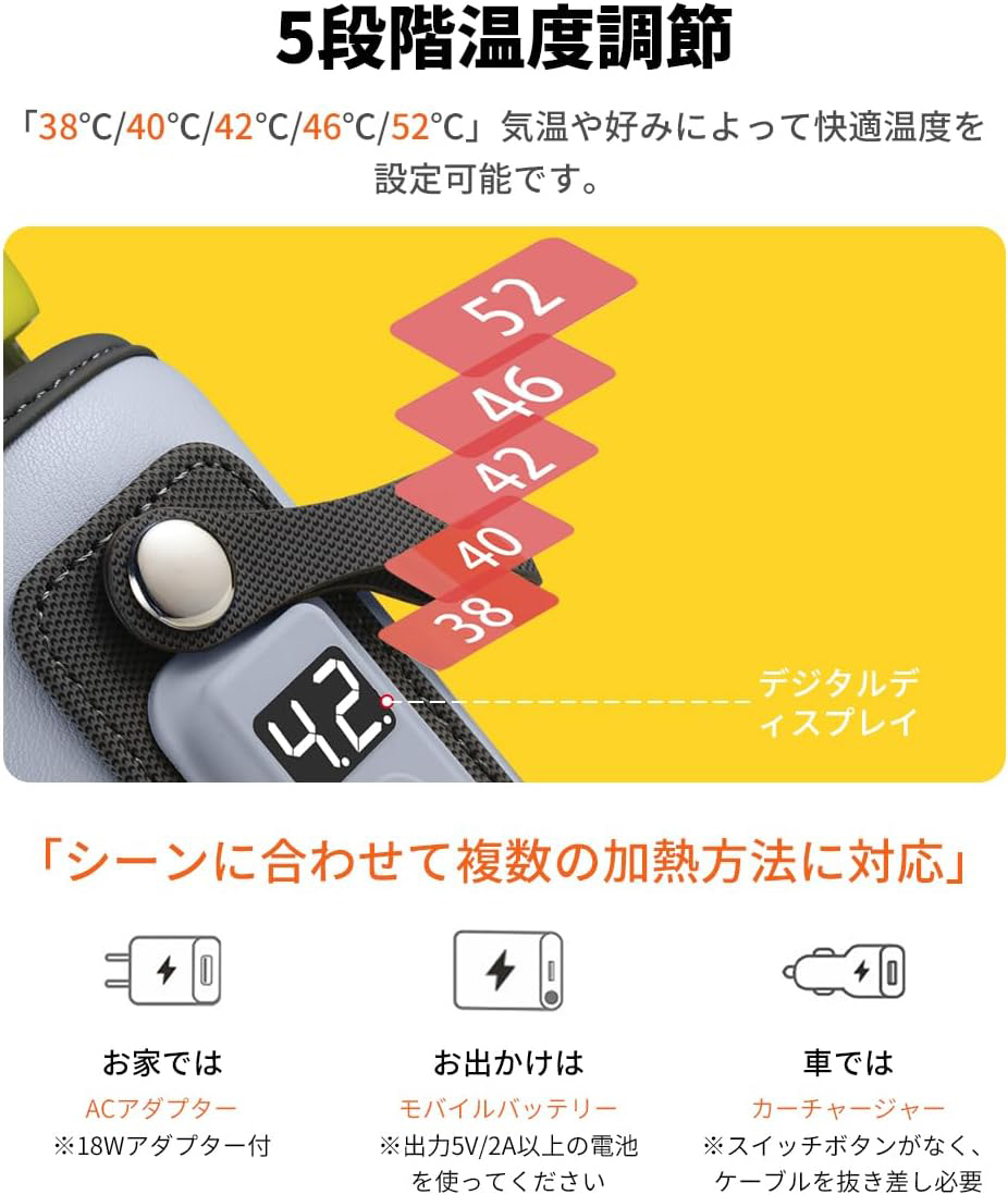 【急速保温、加熱&5段階温度調節】ミルク保温器は熱伝導力が高くて、18Wアダプター付きで容量240mlの哺乳瓶を20℃から52℃に温めるのに36分しかかかりません。(※外気温や使用環境により異なります)。「38℃/40℃/42℃/46℃/52℃」の5段階を細かく調節可能で、気温やお好みによって快適な温度を設定できます。