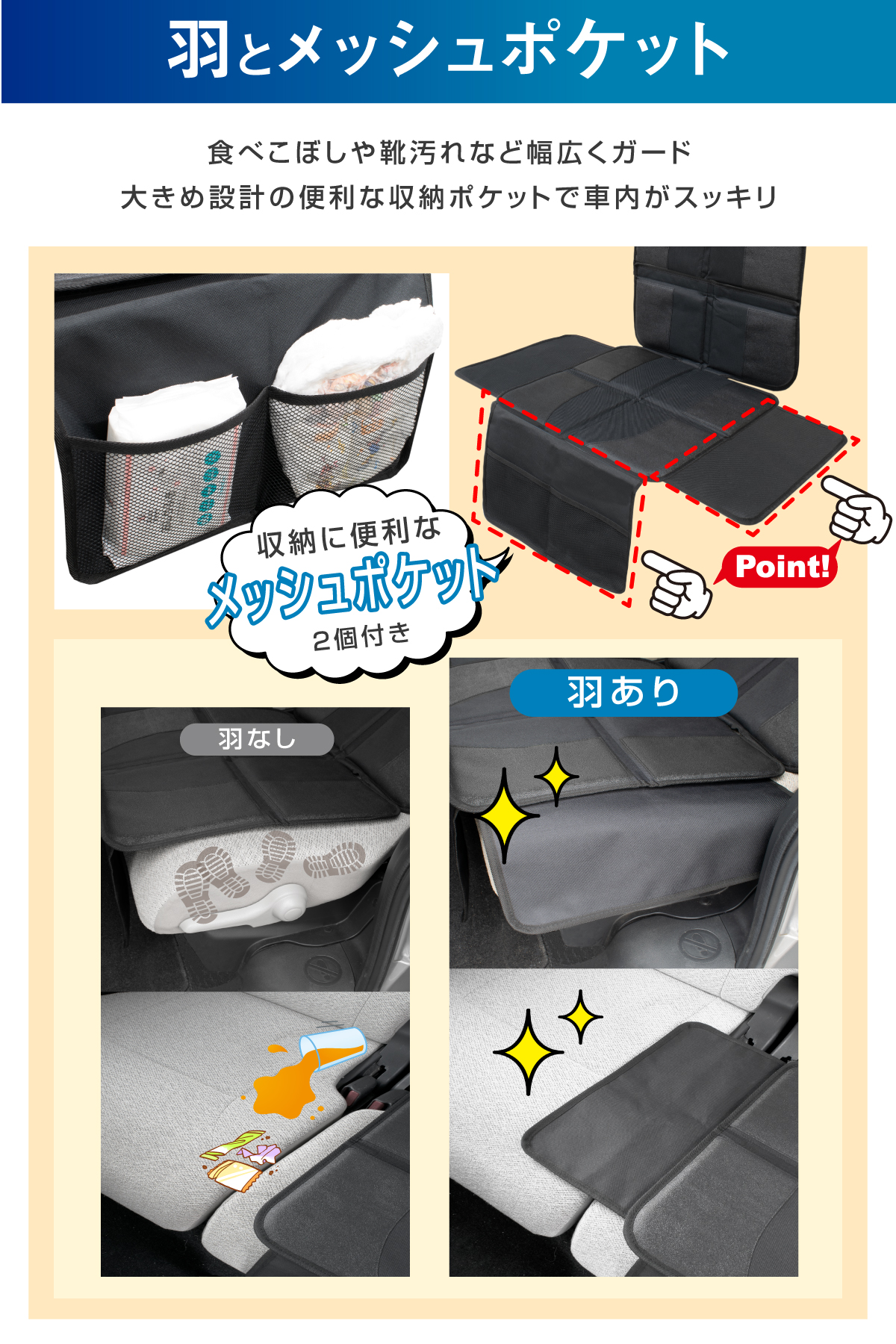 ●脱着、位置替え可能な羽と収納メッシュポケット付き