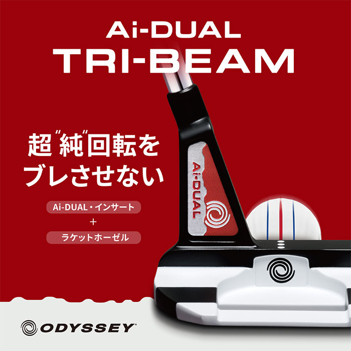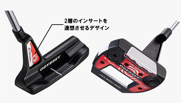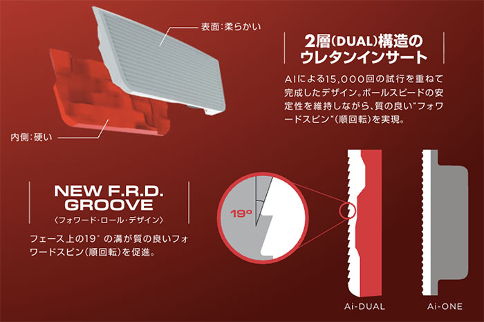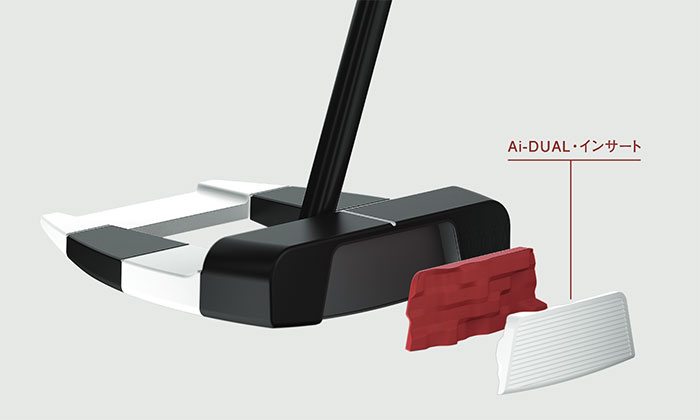 | 「Ai-DUAL TRI-BEAMパター」は、先に登場したAi-DUALパターと同様に、約1万5000回のシミュレーションと72種類のプロトタイプ製作を経て完成したAi-DUAL・インサートを搭載しています。Ai-DUAL・インサートは、Ai-ONE・インサートやAi-ONEチタン・インサートとは違い、樹脂のみでつくられており、ボールを打つ側に柔らかい樹脂、内側に硬い樹脂という構造を採用しています。 |