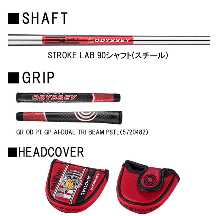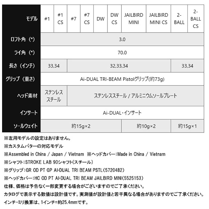 | 「Ai-DUAL TRI-BEAMパター」のヘッドタイプは#1、#7、DW、JAILBIRD MINI、2-BALLの5種類で、それぞれにヒール寄りのスタンダードなネック位置のモデルとセンターシャフト仕様のCSが用意されています。 |