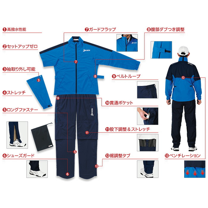 | (1)高撥水性能 家庭洗濯を50回繰り返した後も撥水性能が維持します。 (2)セットアップゼロ スイングしやすい立体裁断により、ストレスのないスムーズなスイングをサポートします。 (3) 袖取り外し可能 気温などに合わせ、長袖としても半袖としても着用できます。 (4) ストレッチ 伸縮性に優れた素材がツッパリ感を軽減します。 (5)ロングファスナー 裾口から膝元まで開くことができるのでパンツの脱ぎ履きが楽にできます。 (6)シューズガード シューズアッパー部分から雨の浸入を軽減します。 (7) ガードフラップ ファスナー部分などからの雨の浸入を防ぎます。 (8) 腹部ダブつき調整 ウエストタブの調整によりダブつきを抑えられます。 (9) ベルトループ ベルトを着用することができます。 (10) 貫通ポケット 右ポケットは貫通しているため、ボトムスのポケットにスムーズに手を入れることができます。 (11) 股下調整&ストレッチ 股下の長さをメンズで最大6cmまで、3段階で調整できます。また、伸縮性に優れた素材がツッパリ感を軽減します。 (12) 裾調整タブ 裾のダブつきを抑えます。 (13) ベンチレーション 通気孔により、ムレを軽減します。 | ||||||||||||||||||||