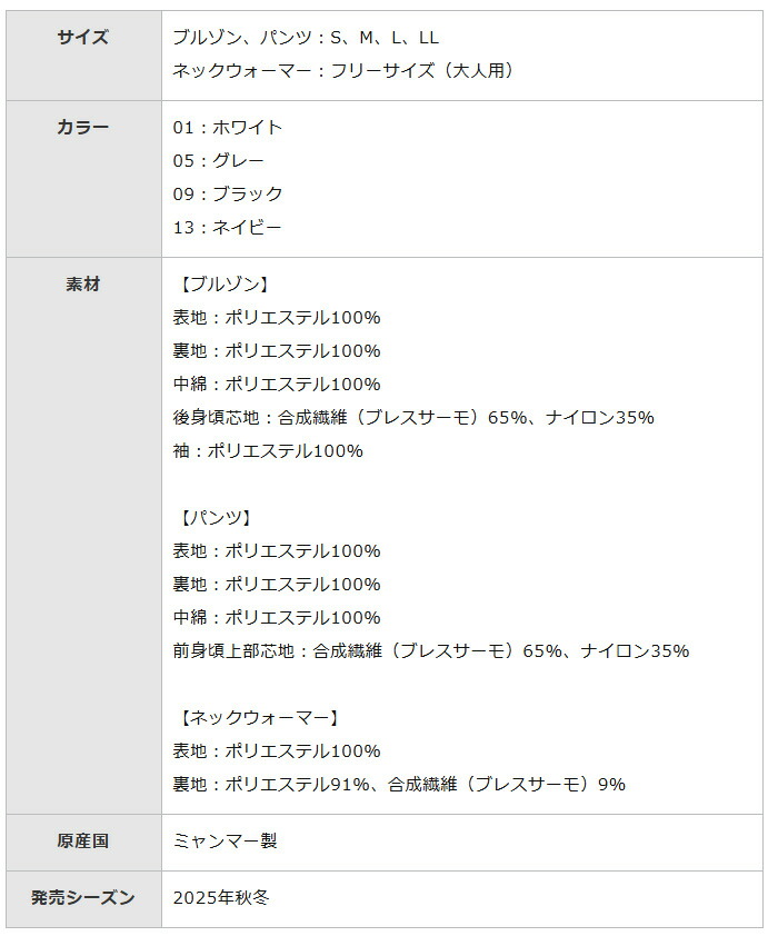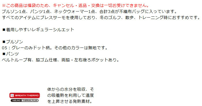ブルゾン1点、パンツ1点、ネックウォーマ―1点、合計3点が不織布バッグに入っています。 すべてのアイテムにブレスサーモを使用しており、冬のゴルフ、散歩、トレーニング時におすすめです。 | ||||||||||||||||||||