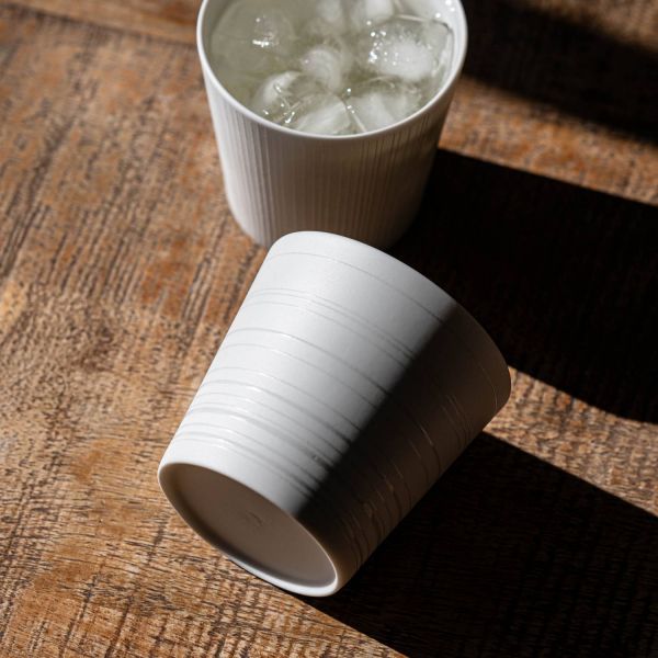 朝昼晩の三食のいつでもお茶や牛乳や野菜ジュース、アルコールならビールや焼酎ロック、ワインにも……ちょうど良いくらい入って、素直に持ち易い。主張はしないけど、存在感は示すデザイン。毎日隣にいても心地よいし、大切な日に近くにあると誇りとなる。カップMはサイズ、フォルム、パターンの全てが定番として違和感が無いことを大切に生み出しました。