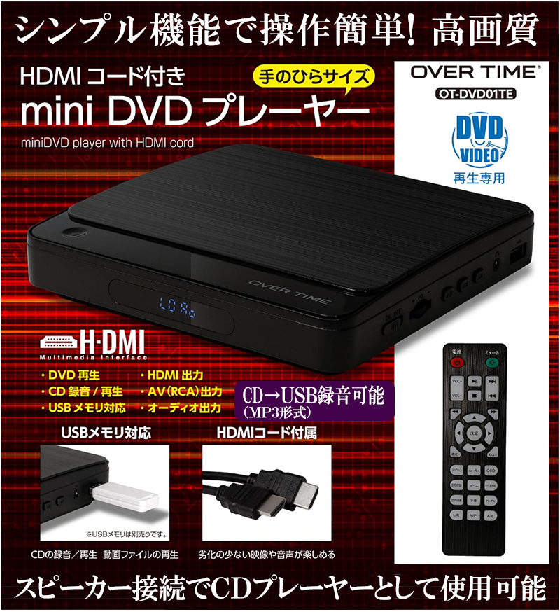HDMIコード付 DVDプレーヤー DVD再生 CD再生 CD録音 USBメモリ対応 動画再生 HDMI出力 高画質DVD USB再生 小型コンパクト OT-DVD01TE アウトレット 国内発送