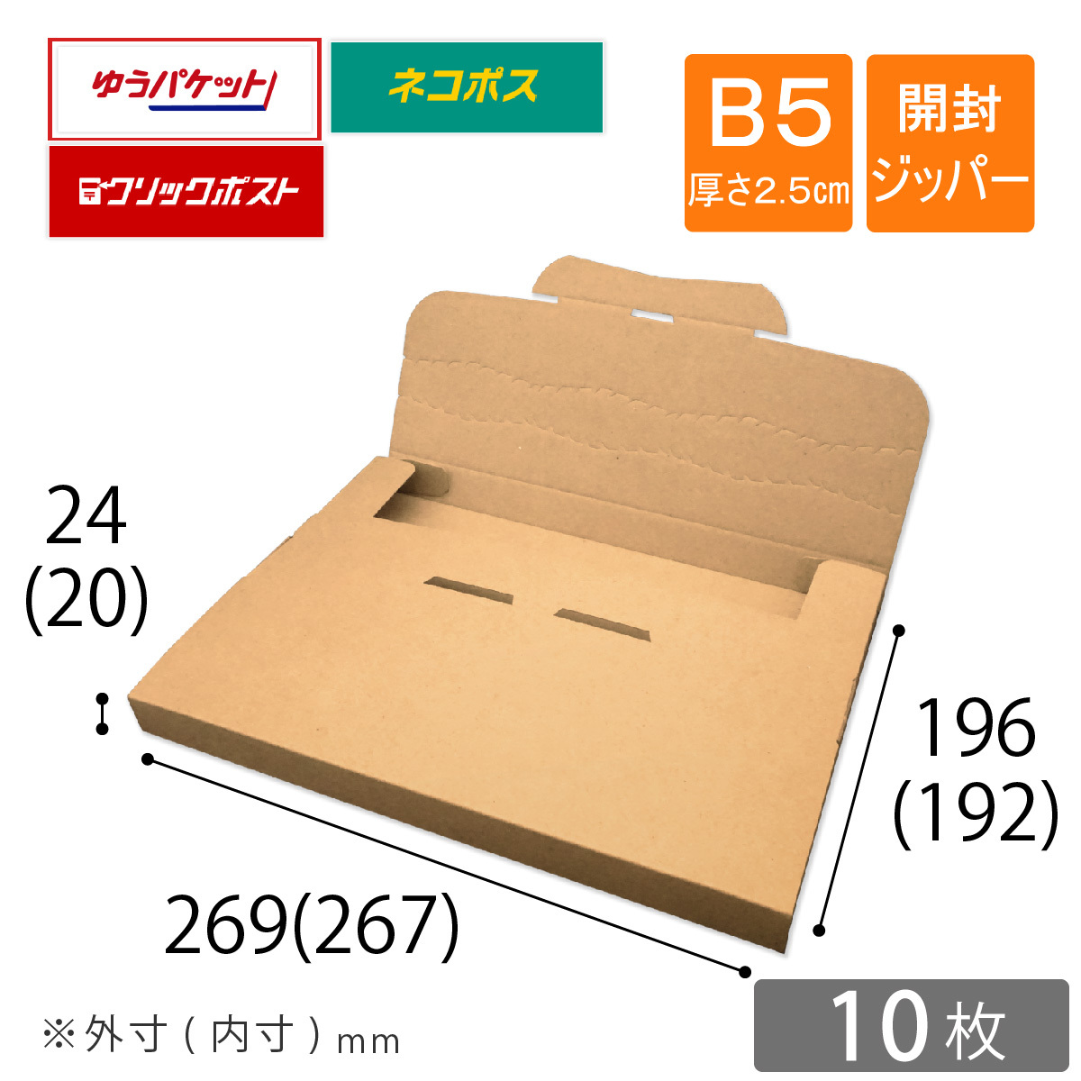 B5厚さ2.5cm ネコポス ゆうパケット クリックポスト メール便ケース ダンボール 段ボール 内寸267×192×20mm 10枚