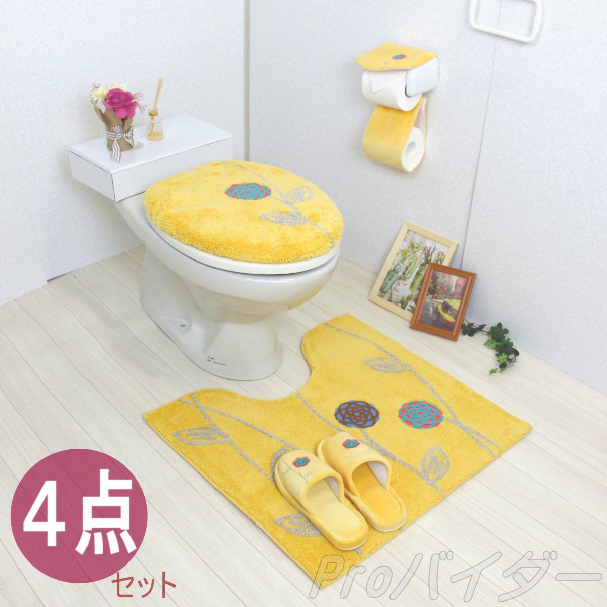 金運を良くするという黄色の普通サイズトイレマット、普通型ふたカバー、ペーパーホルダーカバー、スリッパの 4点セット。