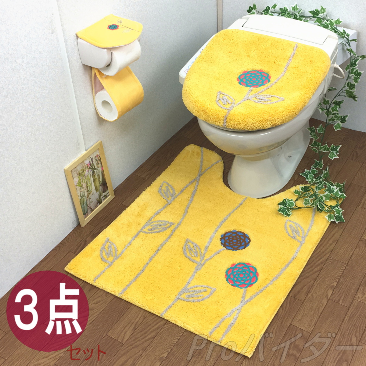 トイレマット 3点セット (約75×63cm) ロング フタカバー ペーパーホルダーカバー 洗浄暖房型 金運 黄色 風水 エトフ トォワ イエロー