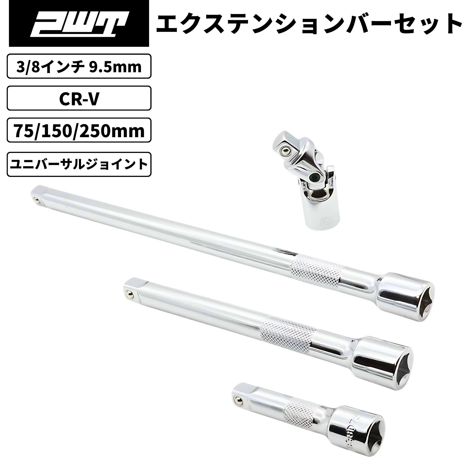 PWT 3/8インチ 9.5mm エクステンションバーセット 75/150/250mm ユニバーサルジョイント 4点セット クロームバナジウム鋼 車整備 バイク工具 自転車 IEB38SET-4