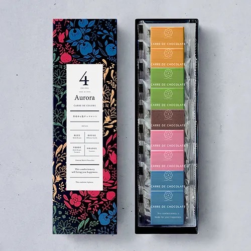 ミルク味の青・酸味の赤・抹茶風味の緑・パイナップルマンゴーとブランデーの香りの橙・ハイカカオの茶、それぞれの風味や色の違いを楽しめるカラーチョコレート。