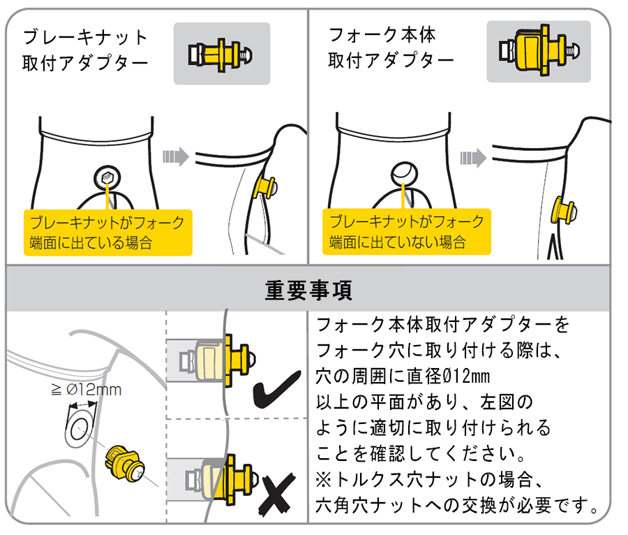 外出しナット止めのキャリパーブレーキや、キャリパーブレーキ以外のブレーキが付いた自転車のフロントフォークには、取り付けできる穴がない、あるいは取り付け部の穴径が違うため、取り付けできません。