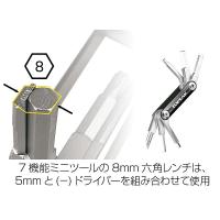 【スペック】 ●アルミ合金 ボディ、クロム バナジウム ツール ●L58 x W35 x H16mm ●70g 7機能ミニツール ●六角レンチ: 2、3、4、5、8mm ●トルクスレンチ: T25 ●(−) ドライバー