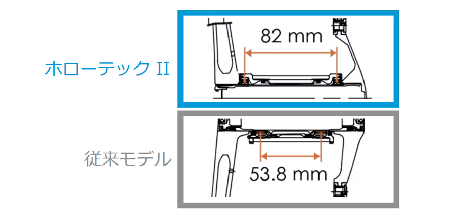 現行フレームのボトムブラケットシェル幅68mmの中で、24mm軸のホローテック IIでは、ベアリングの位置を外側に出すことが可能。