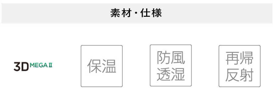 透湿性能(10,000g/m2/hrs)と耐水性能(10,000mm/H2O)に優れ、厳寒期でも、ムレ感のない暖かさを実現します。