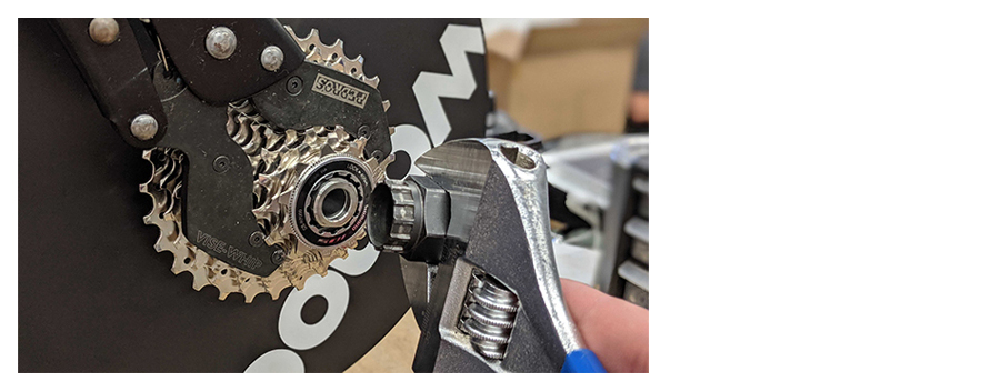 スプロケットはずし(または写真のようにチェーンバイス)とロックリングツールを使用してロックリングを緩め、既存のカセットを取り外してください。