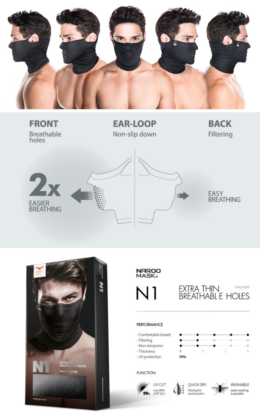 NAROO MASK N1は接触冷感素材(aqua X)を使った夏用UVカット99%のスポーツマスク。