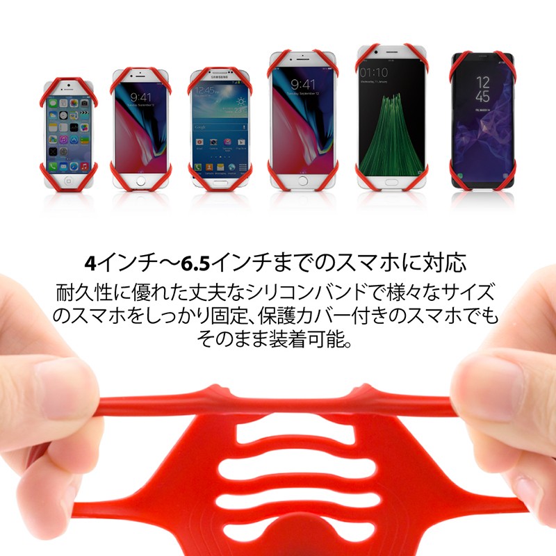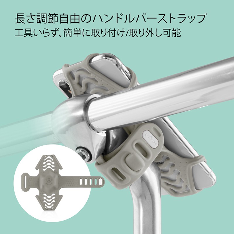 ●伸縮性があり耐久性に優れた シリコンバンドで、4インチ〜6.5インチの様々な端末を装着できます。 ●特許取得のストラップ構造、道具不要で簡単に取り付け/取り外し可能。 ●ハンドルバーの直径を選ばず、自転車、ベビーカーなどに簡単に固定できます。 ●一体成形流線型マウンド、傾斜取り付けで反射低減。 ●衝撃吸収素材でスマホを振動から保護。 ●環境に優しいシリコン素材、汚れにくく、水洗い可能。