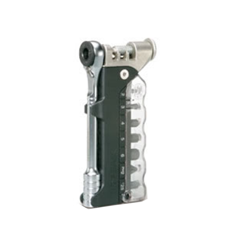 T25 トルクスレンチを含む7種類のビットを差し替えて使うミニ ラチェットレンチ。本格チェーンツールとタイヤレバー(2本)もついて合計11用途
