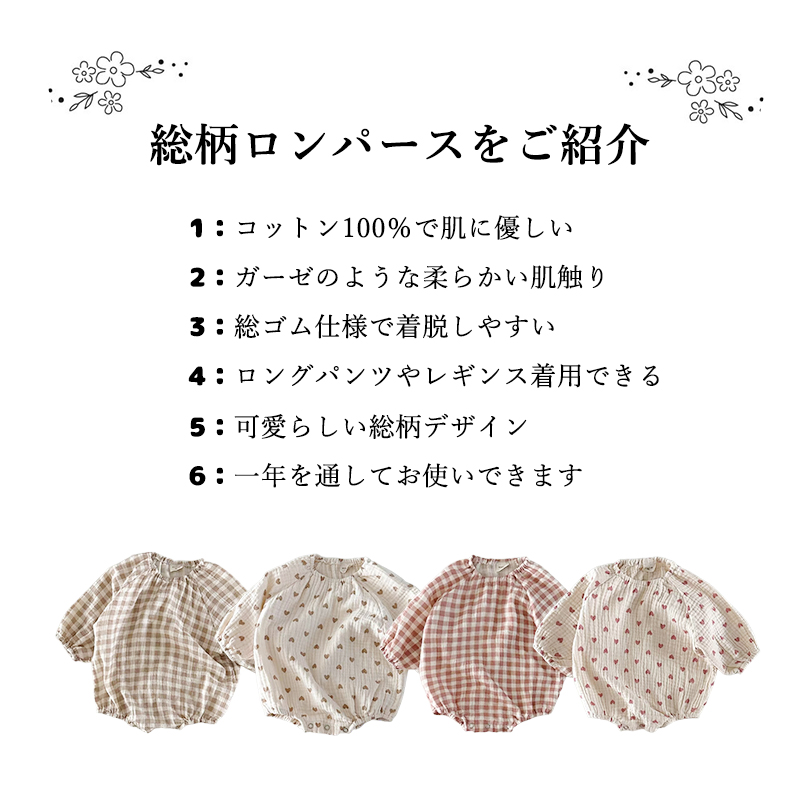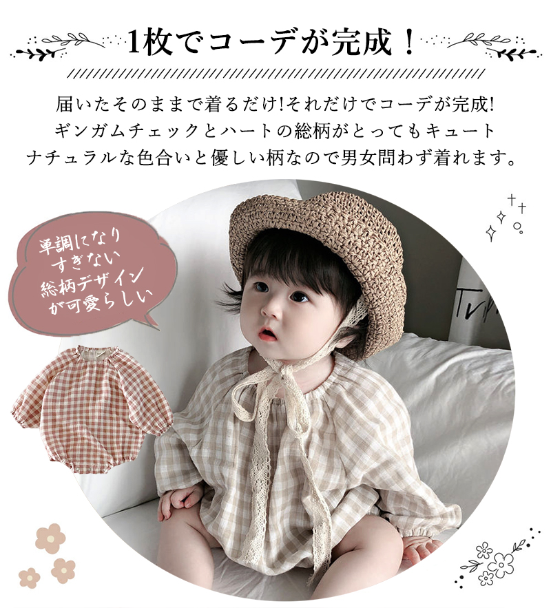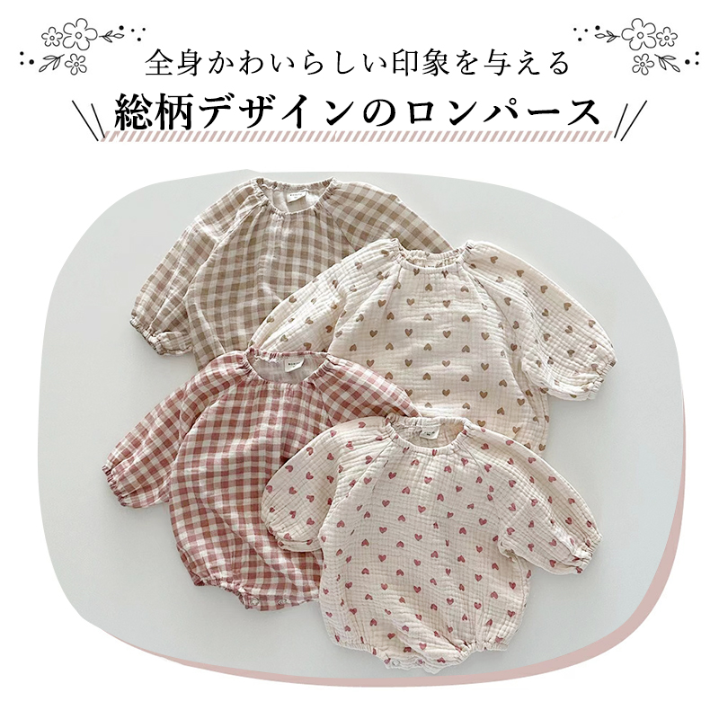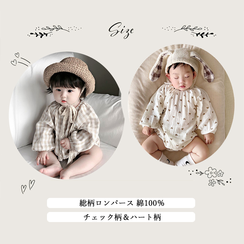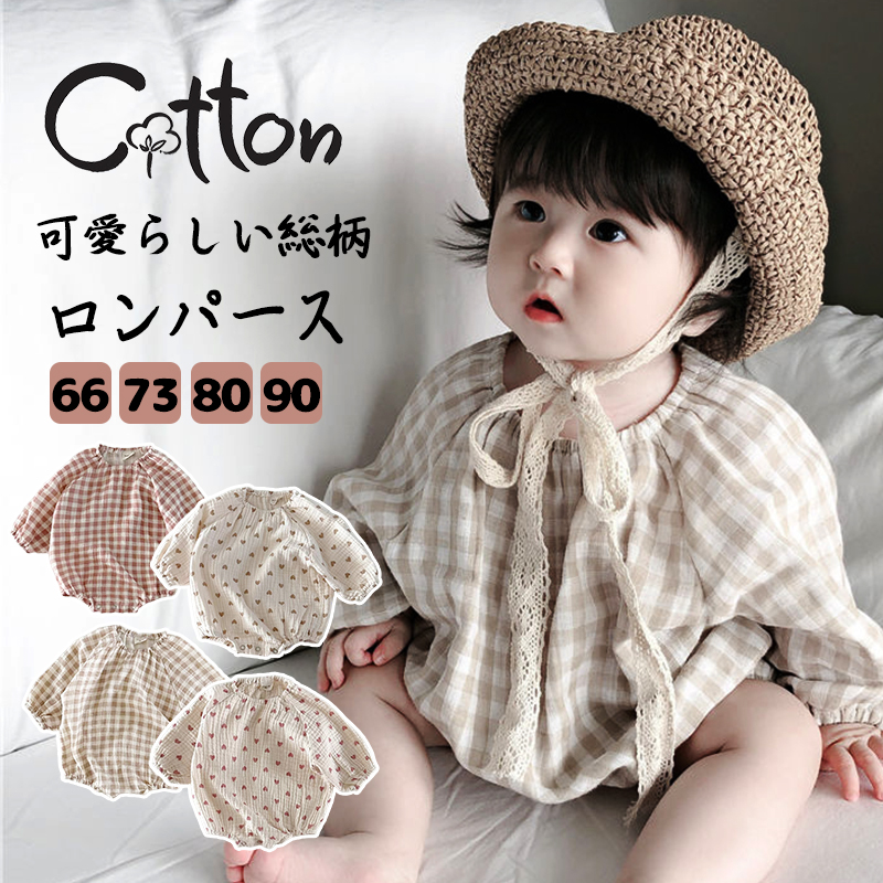 ロンパース ベビー服 キッズ 子供 長袖 カバーオール 男の子 女の子 新生児 赤ちゃん 綿 コットン 100% 韓国 キッズファッション 総柄 チェック柄 かわいい
