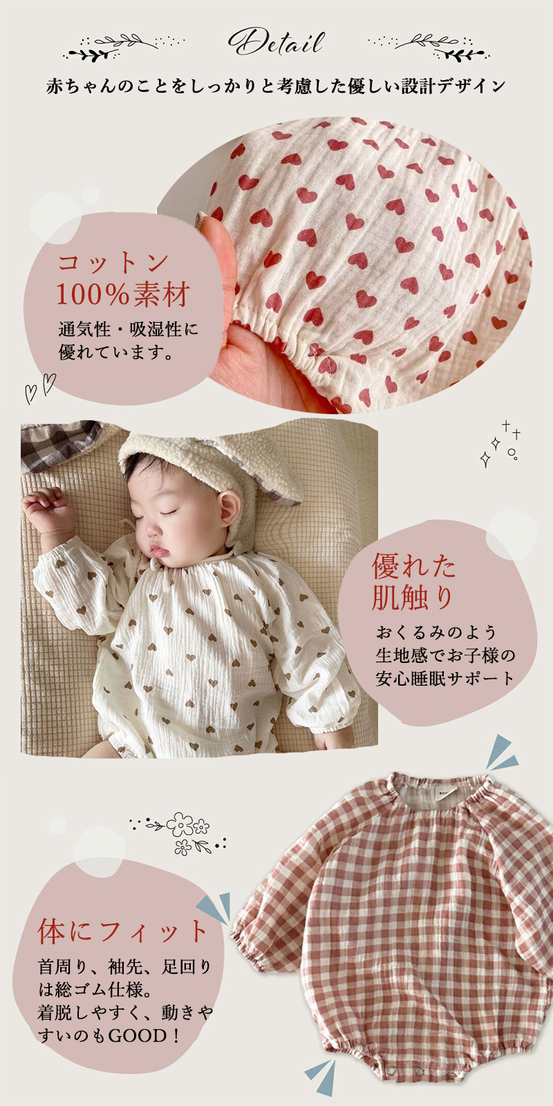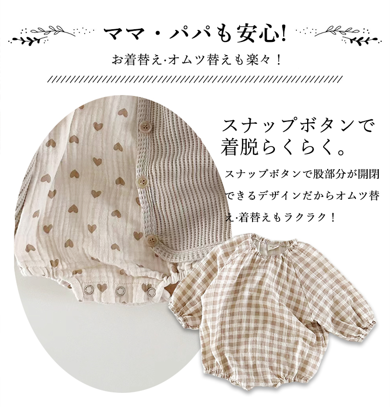 ・股部分には便利なスナップボタンが付いており、おむつ替えも簡単に行えます。