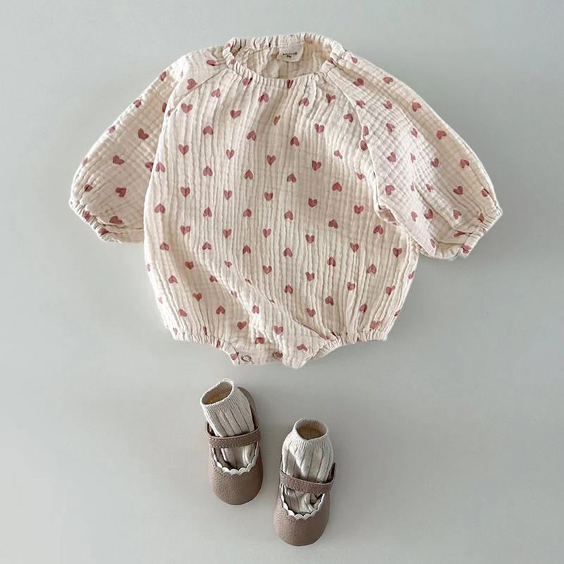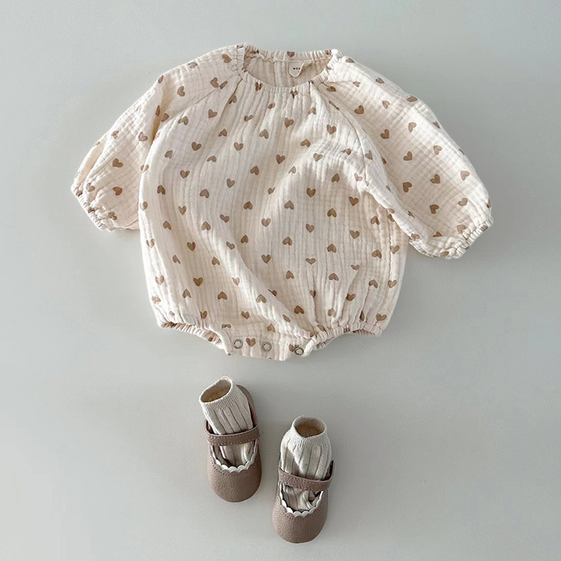 ・ナチュラルで洗練された総柄デザインが魅力的なロンパース。愛らしいスタイルを演出します♪