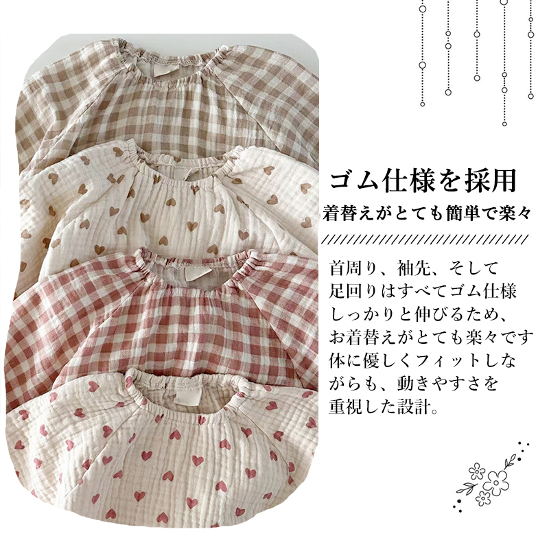 ・首周り、袖先、足回りは総ゴム仕様で、体にやさしくフィットし、アクティブなお子様にもぴったりです。