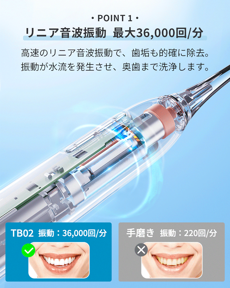 歯磨き粉なしでも強力な水流洗浄能力を発揮します。