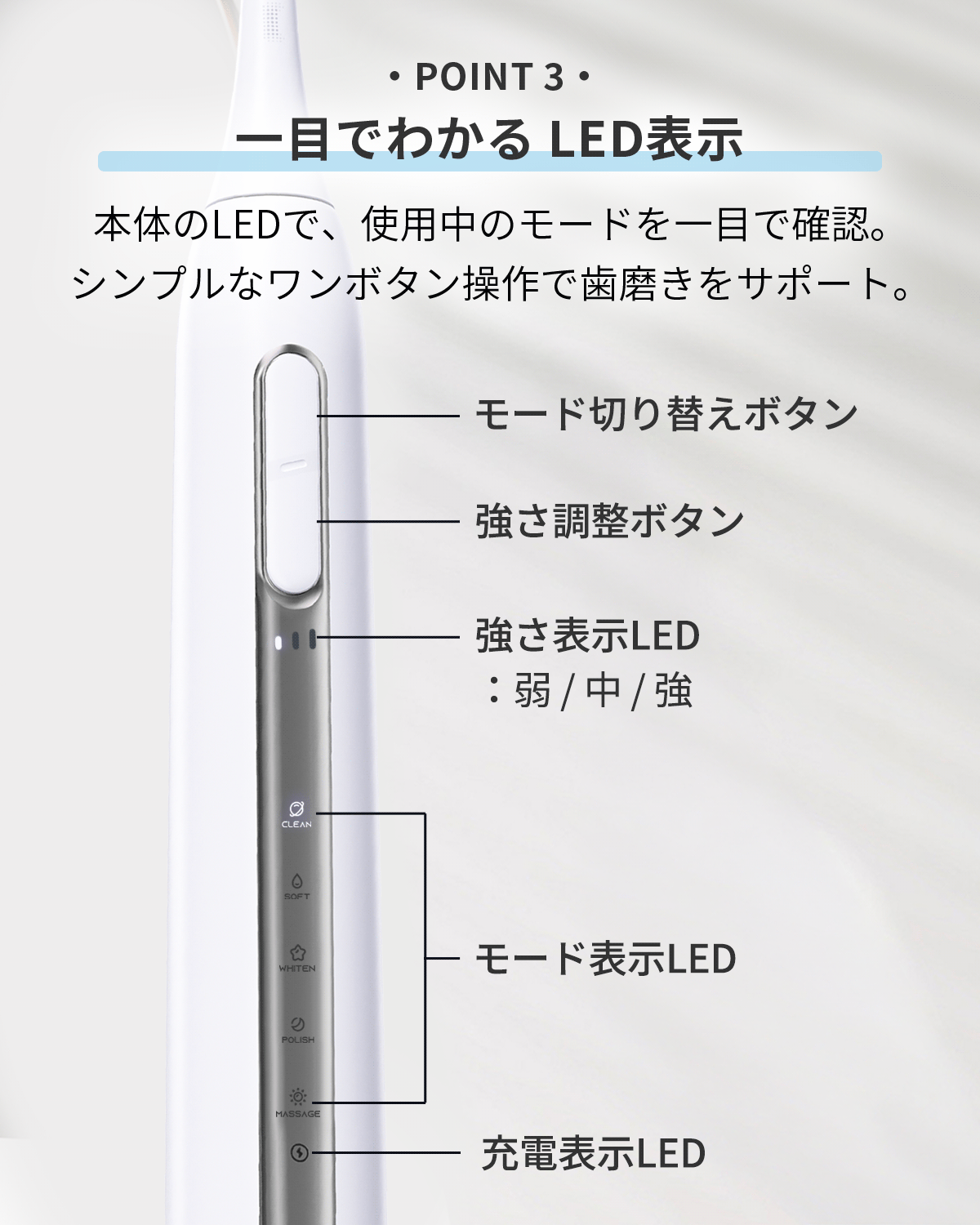 内容品 : 電動歯ブラシ本体 替えブラシx3本 充電ケーブル 取扱説明書(日本語)