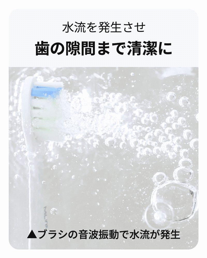 音波式なので、歯に当てた時に発生する気泡や水流で届いていない奥歯や歯間の歯垢を除去します。