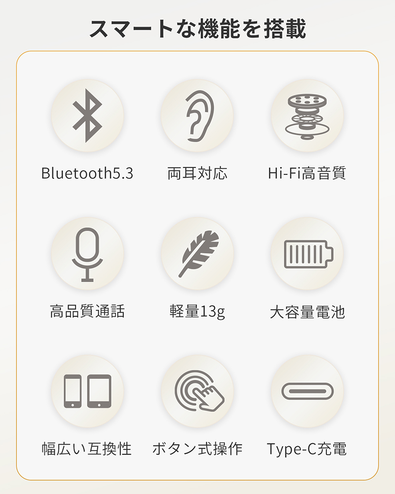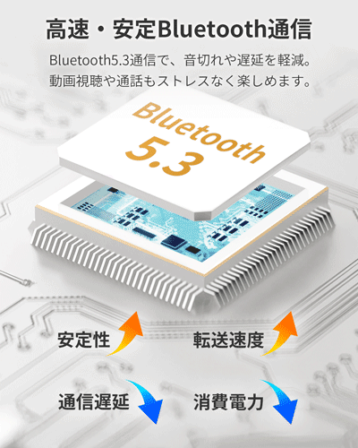 最新Bluetooth5.3を採用し、従来規格よりも接続の安定性を向上。音切れや遅延を抑え、通話や音楽を快適に楽しめます。