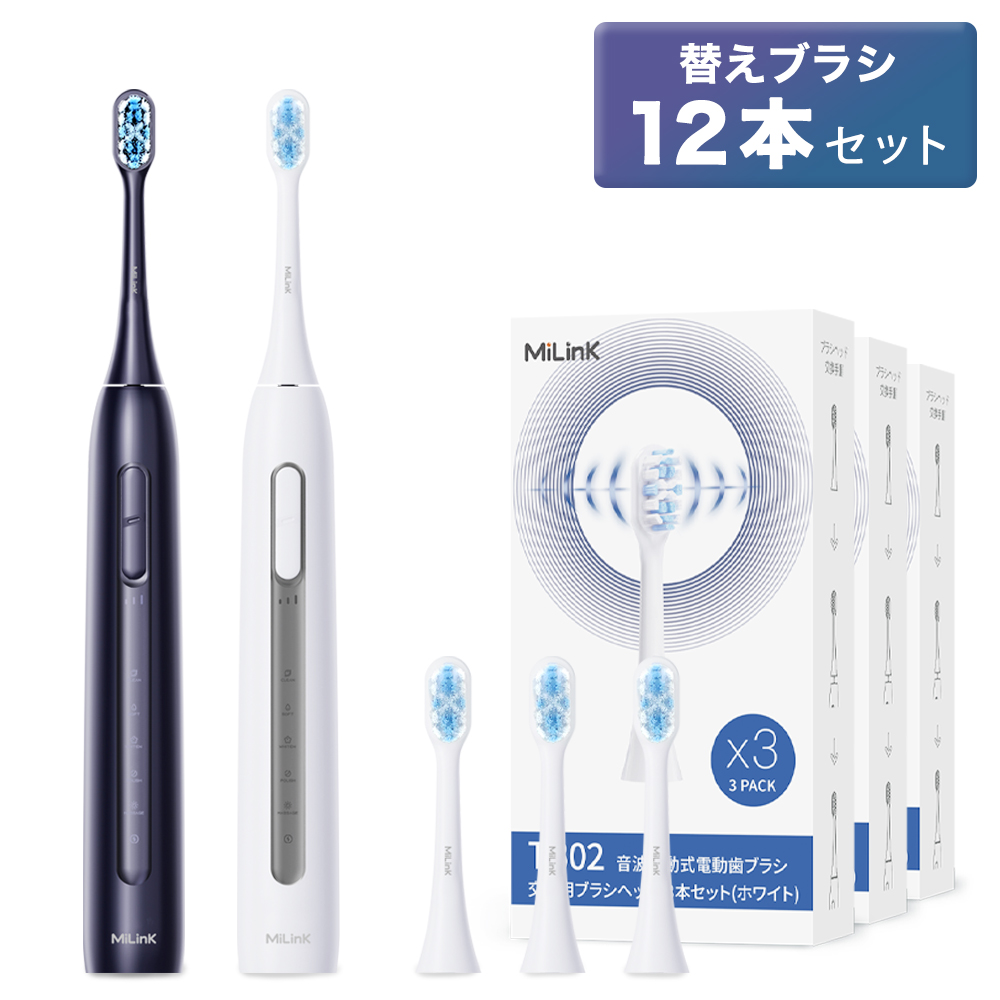 【タイムセール】電動歯ブラシ MiLink TB02 本体 替えブラシ 12本 セット 5つのモード 防水 静音設計 タイマー機能 大人 コンパクト やわらかめ デュポンブラシ