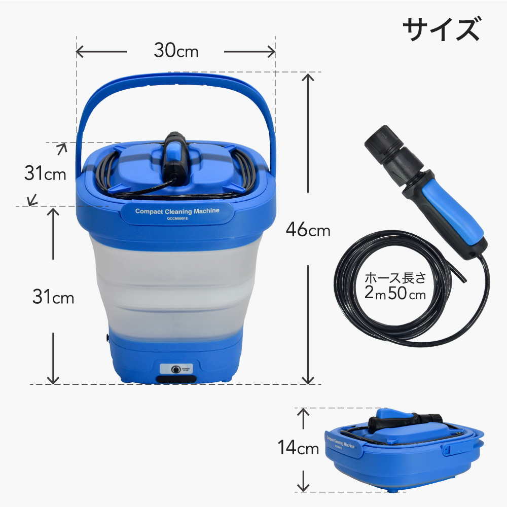 充電式のコンパクトコードレス洗浄機です。バッテリー充電式のコードレスタイプのバケツ型なので、持ち運んで何処でも水洗いができます。水圧は高圧とまでは言えませんが、水道の約2倍の圧力があります。バケツは12Lあるので十分使えます。1つのノズルで4パターンの噴射ができるので、用途に合わせて変えることができます。使わない時は、折りたたんでコンパクトに収納可能です。様々な場所で使える便利なマルチクリーナーです。