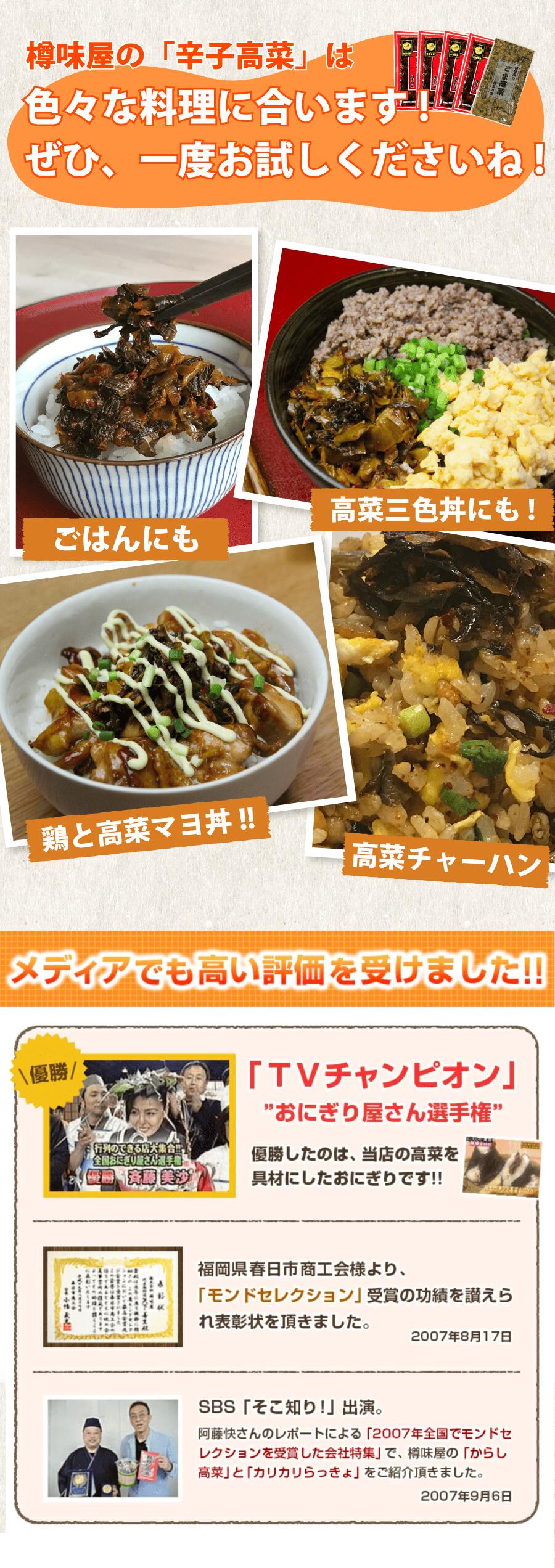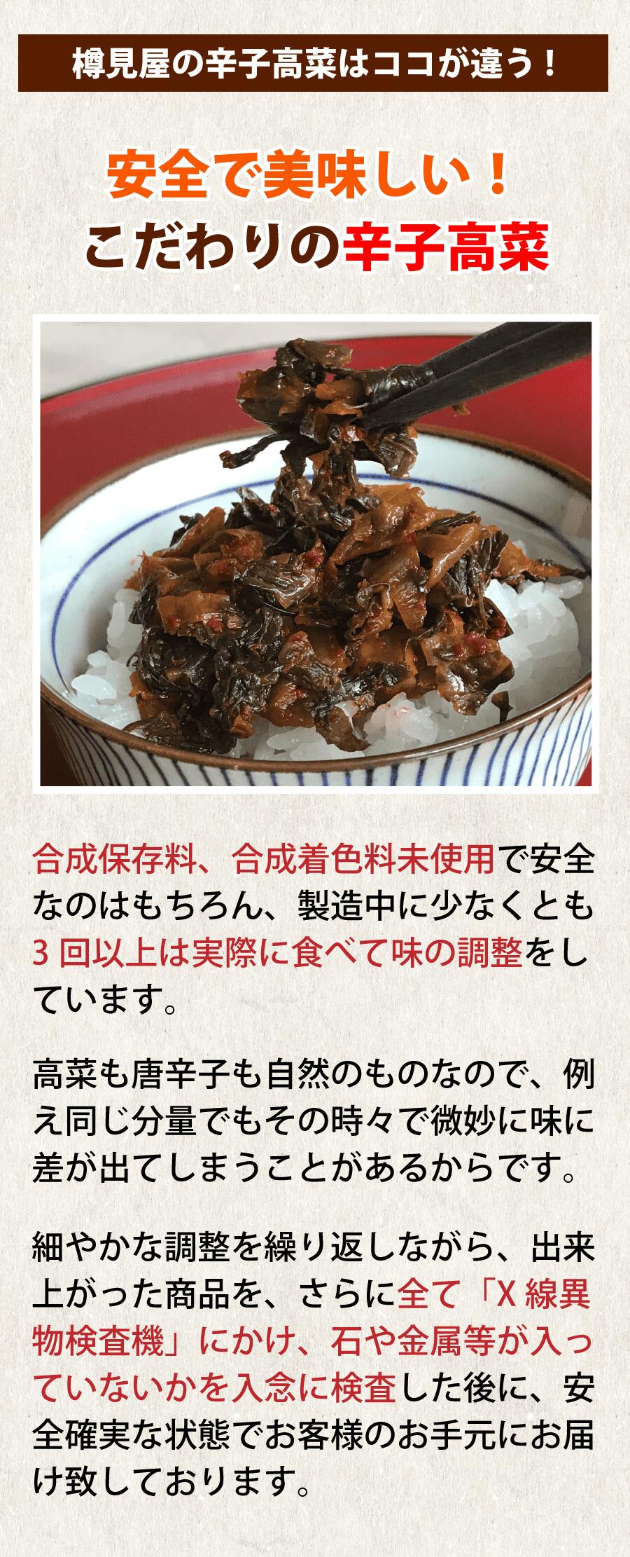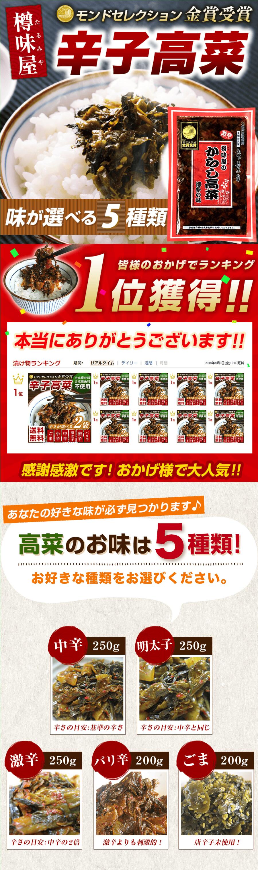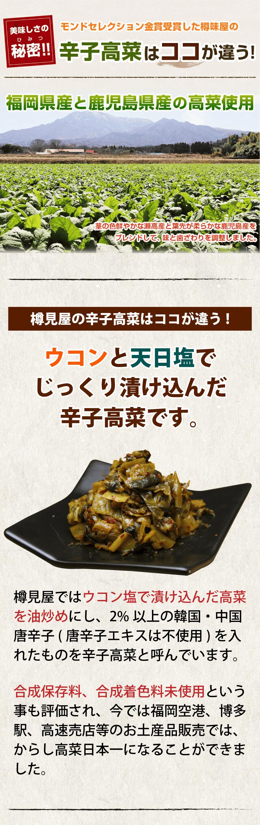 合成保存料・合成着色料 使用していません。 原材料:高菜、食塩、植物油、香辛料(唐辛子、ウコン)、たん白加水分解物、煮干エキス、調味料(アミノ酸等)、酸味料、酢酸(Na)、ホップ (原材料の一部に小麦、大豆をふくむ) 賞味期限:5ヶ月 保存方法:高温常温多湿を避け常温。 製造者:株式会社樽味屋 福岡県春日市白水ヶ丘3-37