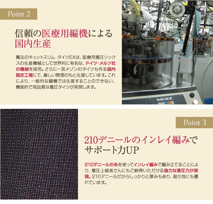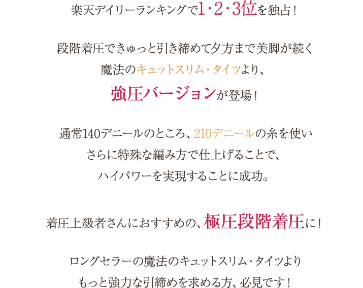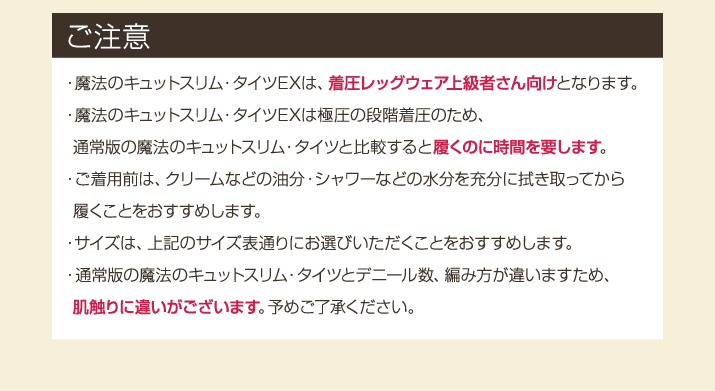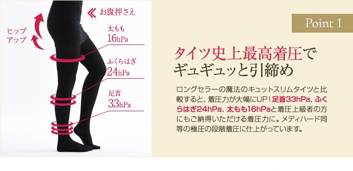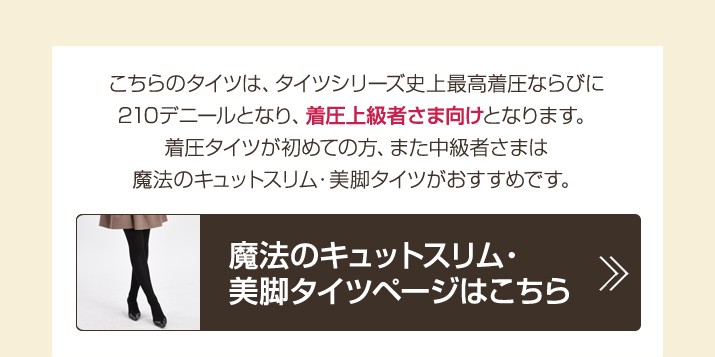 ・魔法のキュットスリム・タイツEXは、着圧レッグウェア上級者さん向けとなります。