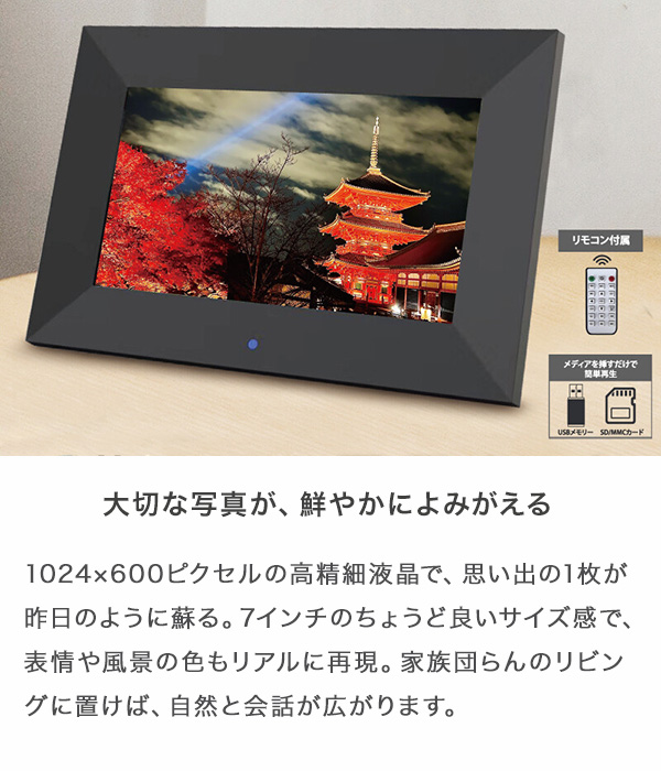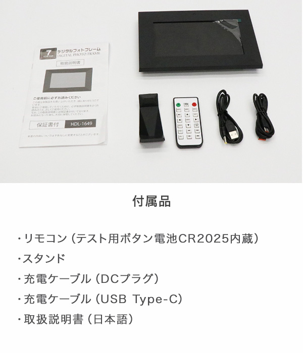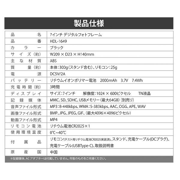 デジタルフォトフレーム 多機能 7インチ 液晶 写真 動画 再生 カレンダー アラーム USB SD 軽量300g コードレス HDL-1649