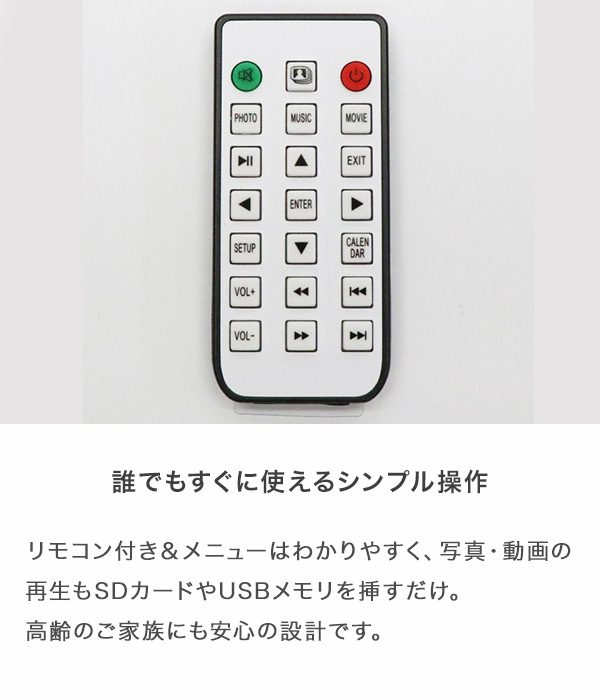 リモコン付き&メニューはわかりやすく、写真・動画の再生もSDカードやUSBメモリを挿すだけ。