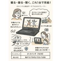 商品説明 | 【録る・観る・聴くが、これ1台で完結】22インチ多機能ポータブルDVDプレーヤー 「テレビの前に縛られたくない」 「でも、画面が小さすぎるのも無理」 そんなわがままニーズに応える、22インチの大画面×マルチ再生対応モデルが登場。 AC/DC/バッテリーの3WAY電源に対応し、車内でも屋外でも、いつものテレビ番組・DVD・録画データを、好きなタイミングで、好きな場所で楽しめます。 こんな人におすすめ! 小型すぎる画面が苦手…という人 録画・再生・音楽管理を1台で済ませたい人 アウトドアや非常時にも使える万能テレビを探している人 \22インチポータブルDVDプレーヤーのここがポイント/ ■ フルHD対応&22インチの大画面で、DVDも地デジも美麗表示 → テレビに近い迫力で、字幕や細かい文字も見やすい! ■ AC・DC・内蔵バッテリーの3WAY電源 → 車載・アウトドア・停電時まで、どこでも視聴OK! ■ 録画・再生・CD音源の録音まで対応のマルチプレイヤー → USBや外付けHDDに録画もできるから、1台で全部済む! 【注目ポイント1】22インチ大画面×フルHDでちゃんと見える 14インチ以下の小型プレーヤーだと、文字が見づらい/操作がしにくいという声も多数。 このモデルは、1920×1080のフルHD対応+21.5インチの広視野角液晶を搭載し、テレビ並みの見やすさを実現。 地デジもDVDも、美しく迫力ある映像で楽しめます。 【注目ポイント2】AC/DC/バッテリーの3WAY電源で使う場所を選ばない リビングはもちろん、車載DC電源、さらには内蔵バッテリーでも駆動。 災害時の情報源としても活用可能で、約2時間の連続視聴が可能。 キャンプ、車中泊、旅行先のホテルなど「電源がない場所」でも安心して使えます。 【注目ポイント3】USBメモリ・外付けHDD録画&CD録音にも対応 録画用USBポートを搭載し、最大1TBまでのHDD録画も可能(推奨500GB)。 CD音源もUSBメモリに直接録音できるので、音楽のデータ化にも便利。 1台で視聴・録画・保存までこなす、マルチな一台です。 【注目ポイント4】DVD再生も幅広く対応。CPRMディスク再生もOK 地デジ録画対応のCPRMディスク、MP3・JPEG・WMAなど、幅広いフォーマットに対応。 昔のDVD-Rから、最新の録画ディスクまで幅広く再生できます。 【注目ポイント5】カーアダプタ・リモコン・AVケーブルなど充実の付属品 AVケーブル、miniB-CASカード、イヤホンまでフルセット。 車載用アダプタやリモコンも付属しているので、家族全員が「届いたその日から」すぐ使えます。 【実際に使ってみた】 旅行前の週末に車内に設置してみましたが、リモコン操作もスムーズで映像もくっきり。 ホテルでもAC電源に切り替えて夜に映画鑑賞。まさにポータブルの限界突破という感じでした。 アウトドアに持っていける「据え置き級ポータブル」は、想像以上に便利です。 【スタッフVoice】 バッテリー駆動時間が約2時間という点だけは、映画2本見るにはやや心許ない印象。 とはいえ、車載電源やAC併用なら問題なく、むしろ3WAY対応の安心感は大きい。 画質・視認性・操作性ともに、これまでのポータブルプレーヤーとは別次元の完成度だと思います。 【商品特徴・キーワード】 21.5インチ ポータブルテレビ ポータブル液晶テレビ 21.5型 車載テレビ 21.5インチ 録画機能付き バッテリー内蔵 地デジ ポータブルテレビ 録画 DVD再生機能付き フルHD HDMI端子付き USB録画対応 車載用アダプタ付き キャンピングカー アウトドア用 災害用 車中泊 DVD再生 #22インチ ポータブルテレビ 商品仕様 ## 基本仕様 ### サイズ・重量 - **外形寸法**: 約幅506×奥行45×高さ333mm - **重量**: 約2.9kg ### 電源 - **ACアダプタ**: - 入力:AC100V-240V 50/60Hz - 出力:DC12V 3.0A - **カーアダプタ**: - 入力:DC12V - 出力:DC12V 3.0A - **内蔵充電池**: DC7.4V/5000mAh/37Wh - **充電時間**: 約7.5時間(電源切状態) - **連続使用時間**: 約2時間 - **待機電力**: <0.5W - **消費電力**: 28W(ACアダプター使用時) ## 液晶パネル - **サイズ**: 21.5インチ - **解像度**: 1920×1080 - **応答速度**: 14ms - **アスペクト比**: 16:9 - **コントラスト比**: 1000:1 - **視野角度**: 140°×140° ## 入出力端子 ### 入力端子 - アンテナ入力端子×1(地上デジタル) - miniB-CASカードスロット×1 - USB端子(録画用)×1 - AV入力端子×1 - HDMI端子×1(Ver.1.4)v - USB端子(外部メモリデータ再生/CD録音)×1 ### 出力端子 - イヤホン端子(ステレオミニピン3.5mm) ## 受信・再生機能 ### 受信周波数 - UHF470MHz-770MHz(UHF13-62ch) - CATV:C13-C63 - ※インターネット回線を利用した地デジ受信環境には非対応 ### メディア再生対応フォーマット - **動画**: MP4・WMV・AVI・3GP・RMVB/MVB - **画像**: JPEG・BMP - **音声**: MP3・WMA・WAV・AAC - **テキスト**: TXT ### 再生可能ディスク対応フォーマット - DVD、DVD-R/RW、CD、CD-R/RW - DVD-VIDEO、DVD-VR(CPRM)、CD-DA - JPEG、MP3 ### 対応外部メモリ容量 - **地デジ録画用ポート**: 500GB推奨(1TBまで動作確認済み) - **データ再生(録音)用ポート**: 32GBまでのメモリーを推奨 ## 音響・操作 - **スピーカー出力**: 3W×2 - **リモコン到達距離**: 3m以内(本体リモコン受光部正面から) - **許容温度範囲