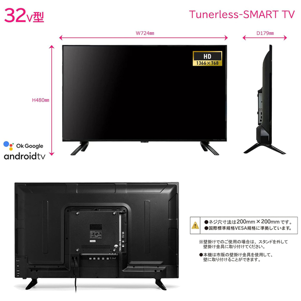 | 商品説明 | 放送波に縛られず、ネット動画を大画面で楽しむための専用設計です 32インチ ハイビジョン GoogleTV搭載 チューナーレス スマートディスプレイ ━━━━━━━━━━━━━━━━ ■ 地上波放送を必要としない、動画配信サービス専用の1台です ━━━━━━━━━━━━━━━━ YouTube、Netflix、Amazon Prime Videoといった主要な動画配信サービスをプリインストールした、ネットコンテンツ視聴に特化したディスプレイです。 地上波やBS・110度CS放送用のチューナーをあえて搭載していません。テレビ放送の受信を前提とせず、インターネット上の多様なコンテンツをストレスなく楽しむことを目的に開発しました。Google Playから好みのアプリを追加することも可能な、現代の視聴スタイルに合わせた仕様です。 ━━━━━━━━━━━━━━━━ ■ ご購入前に、設置環境との適合をご確認ください ━━━━━━━━━━━━━━━━ 本体の横幅は71.8cm、スタンドを含む奥行きは18.1cmです。32インチというサイズに加え、本体質量は約3.7kgと非常に軽量な設計を採用しました。寝室や書斎、ワンルームなど限られたスペースへの設置や、場所を移動させる際の物理的な負担を軽減します。 壁掛けを検討される場合は、背面のネジ穴間隔がVESA規格の200x200mmに対応していることをご確認ください。 このようなシーンでの不便を解消します ・複雑な操作を省いてすぐに動画を見たいとき: 付属のリモコンには、主要な動画配信アプリへ直接アクセスできるダイレクトキーを配置しました。電源を入れてから視聴開始までの手順を最小限に抑えます。 ・スマホの小さな画面から解放されたいとき: Chromecast built-in機能を搭載しています。スマートフォンで再生中の動画をそのまま大画面へ映し出し、家族や友人と一緒に視聴する作業がスムーズに行えます。 ・リモコン入力を手間に感じるとき: Googleアシスタントに対応したマイク内蔵リモコンです。話しかけるだけでコンテンツの検索や製品の操作ができ、文字入力の負担を軽減します。 ━━━━━━━━━━━━━━━━ ■ 重要 ご購入前の事前確認事項 ━━━━━━━━━━━━━━━━ ・テレビ放送の視聴はできません: 地上デジタル、BS、110度CS放送のチューナーを内蔵していません。本機単体で通常のテレビ番組を見ることはできませんので、ご注意ください。 ・インターネット環境が必須です: 動画配信サービスを利用するには、Wi-Fiまたは有線LANによるインターネット接続環境を整えていただく必要があります。 ━━━━━━━━━━━━━━━━ ■ 機能を絞り込むことで得られる利便性と特長 ━━━━━━━━━━━━━━━━ 映像と音響の基本性能: 画素数1366x768のパネルを採用。HDR10およびHLGに対応し、明暗の差がある映像も適切な質感で描写します。音響面ではDolby Audioに対応した5W+5Wのスピーカーを内蔵しており、動画視聴に十分な音声を確保します。 外部機器との連携: HDMI端子を3系統備えており、ゲーム機やパソコンを同時に接続したまま使い分けが可能です。Bluetooth 5.0も内蔵しているため、ワイヤレスヘッドホン等との連携も容易です。 省エネ設計: 動作時の消費電力は45Wと、日々の運用コストに配慮した設計です。準備や後片付けの手間が少ない軽量な機体は、日々の使い勝手を向上させます。 ━━━━━━━━━━━━━━━━ ■ スタッフの声(実務的な視点からの評価) ━━━━━━━━━━━━━━━━ 3.7kgという軽さは、実際に手に取ると驚くほどの扱いやすさです。女性一人でも無理なく箱から出して設置できるため、導入時の心理的なハードルが低くなります。操作面では、Google TVの軽快な動作が印象的です。音声検索を使えば、長い映画のタイトルを検索窓に一文字ずつ打ち込む作業から解放されます。普段テレビ放送を全く見ず、ネット動画が生活の中心という方にとって、非常に合理的な道具となります。 ※記載内容はスタッフ個人の使用感に基づいた内容であり、環境や個人差によって感じ方は異なります。すべてのお客様に同様の体感を保証するものではありません。 ━━━━━━━━━━━━━━━━ ■ よくあるご質問 ━━━━━━━━━━━━━━━━ Q. スマホの画面を映すことはできますか? A. はい。Chromecast built-in機能を搭載しているため、対応するアプリから簡単に画面を映し出せます。 Q. アプリの追加はできますか? A. Google Playストアから、好みのアプリをダウンロードして使用可能です。 Q. 壁掛けはできますか? A. 可能です。VESA規格200x200mmに対応した市販の金具をご用意ください。 Q. Bluetoothのイヤホンは使えますか? A. Bluetooth 5.0に対応しており、ワイヤレス機器との接続が可能です。 ■ 製品スペック一覧