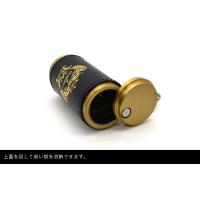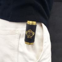 ブラックレザーにゴールド箔押しを施したオロビアンコの携帯灰皿。牛革巻きの上質な質感とフタ付き構造で持ち運び時も安心。ナスカン付きでバッグやベルトに装着でき、ピルケースとしても使用可能です。日本製の丁寧な仕上がりで、喫煙具としてはもちろん、男性向けギフトやプレゼントにもおすすめ。専用ボックス・リボン付き。