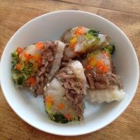 ケーキの形をしていますが、全部ゴハンとしていただく食材でできています。柔らかく炊いた発芽玄米、ターキーのボイル、各種旬のビタミンたっぷりな野菜がたくさん入って、寒天寄せになっています。