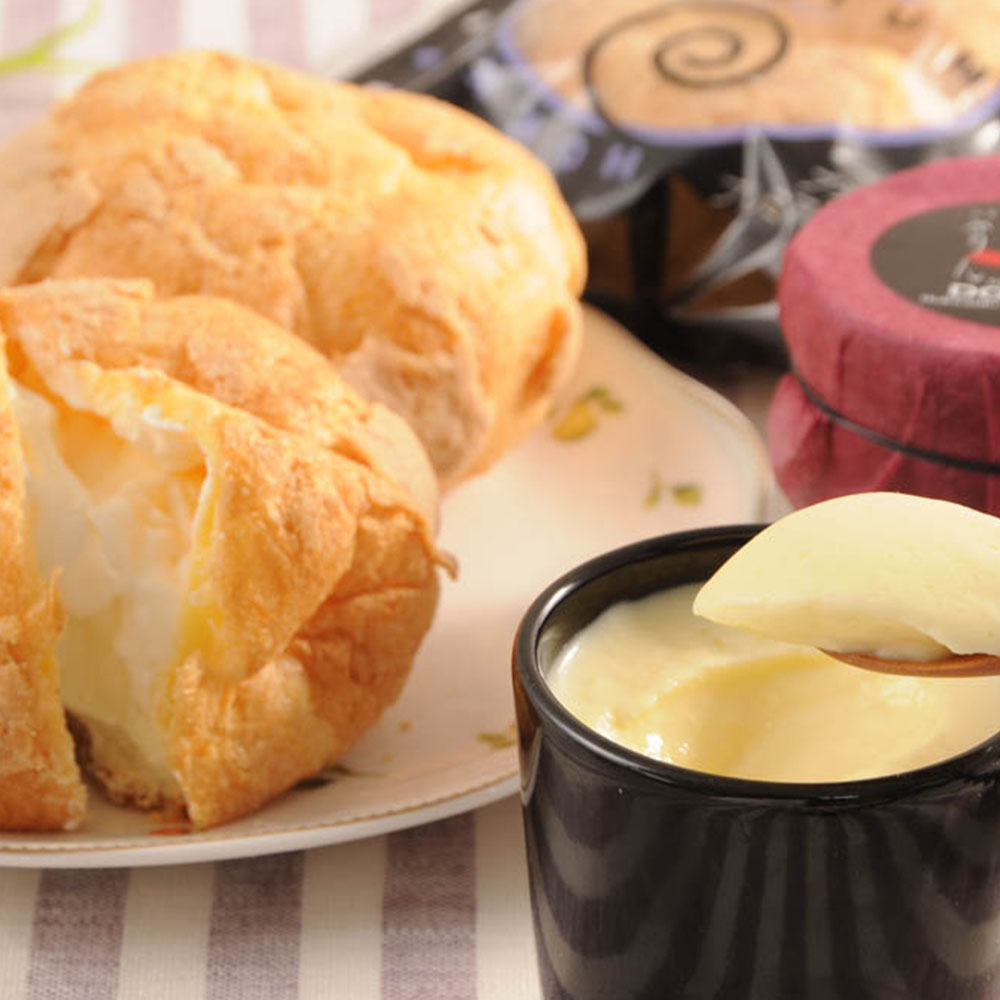 放牧牛に認定された十勝橋本牧場の希少価値のブラウンスイス牛の生乳を使用した黒陶器に入ったプリンとジャンボなミルクシューのセット