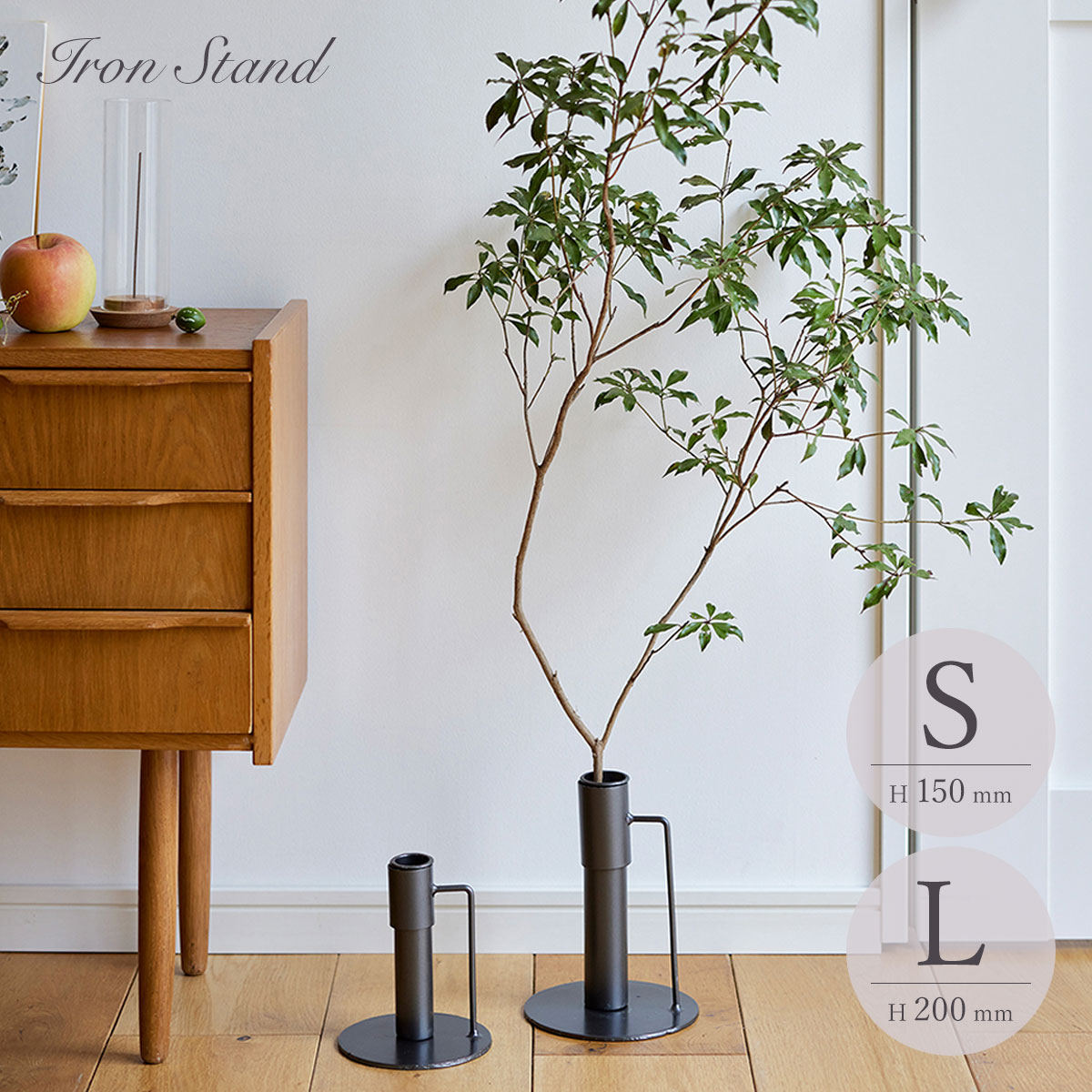 | 枝ものを活けて飾れるアイアンスタンド。 七夕の笹はもちろん、ドウダンツツジやスモークツリーを飾るのにぴったり。 冬にはモミの木のスタンドとしても◎ 一年を通して使っていただけます。 筒部分が取り出せるので、普段の水替えも簡単です。 筒部分を使わずにドライフラワースタンドとしても使用いただけます。