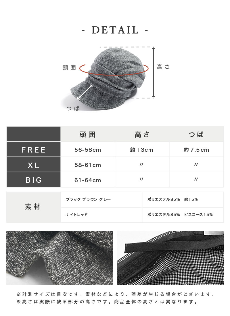 | ※高さは実際に被る部分の高さです。商品全体の高さとは異なります。 (平置き)との記載がある場合、素材が柔らかい、伸縮性等の理由から、平置きでの計測サイズを記載致しておりますので、ご確認下さいませ。 ・画面上と実物では多少色が異なって見える場合がございます。 ・お取り扱いの前に品質ネームタグの記載をご確認下さいませ。 ・商品の品質ネームタグにカラー表記はございません。 ※モデル撮影は屋外の為、実際の商品と色合いが異なります。単品商品の撮影画像が実際の商品と色合いが近くなっておりますので、ご参照下さいませ。 ※春夏に比べ、生地やサイズが異なる為、ご注意下さい。 ※つば先ワイヤー入り ※内側後方部分サイズ調整紐 ※【ブラック】【ブラウン】【グレー】サイズ調整マジックテープ |