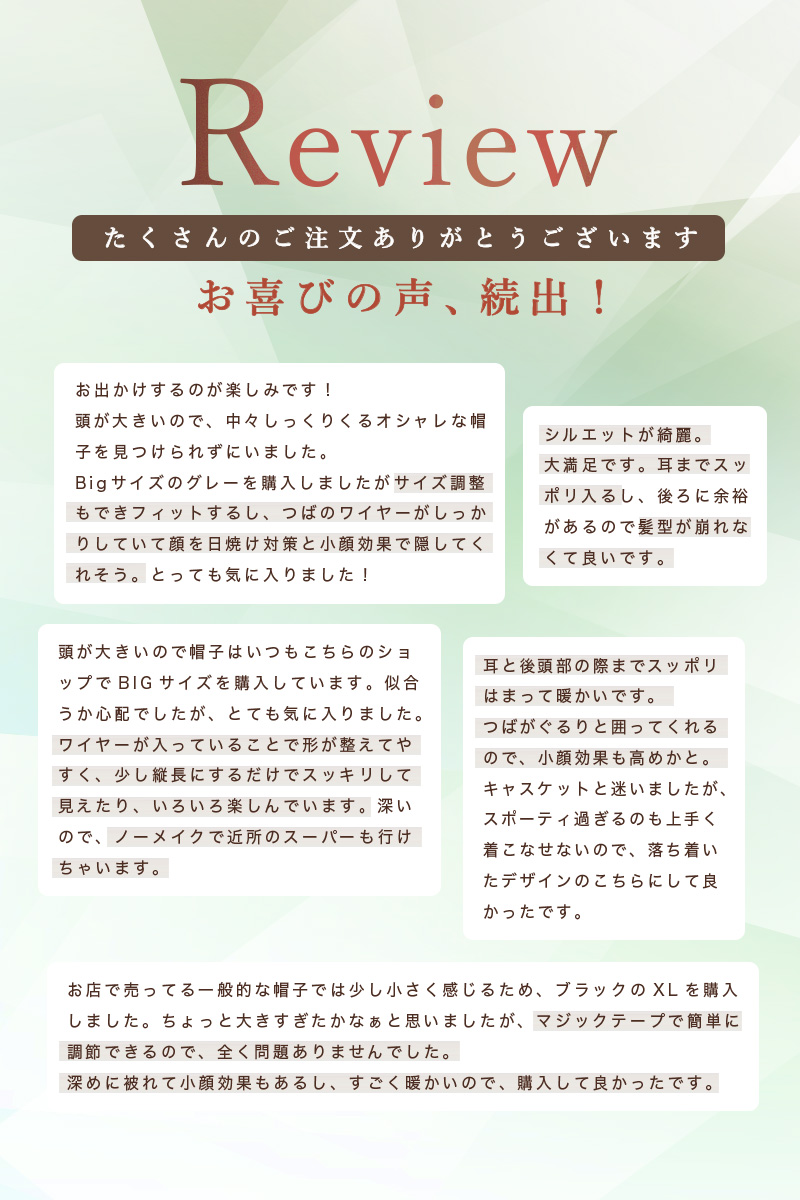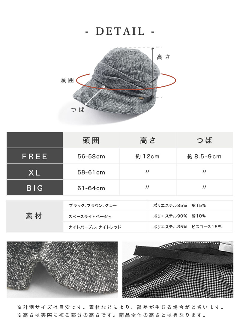 | ※高さは実際に被る部分の高さです。商品全体の高さとは異なります。 (平置き)との記載がある場合、素材が柔らかい、伸縮性等の理由から、平置きでの計測サイズを記載致しておりますので、ご確認下さいませ。 ・画面上と実物では多少色が異なって見える場合がございます。 ・お取り扱いの前に品質ネームタグの記載をご確認下さいませ。 ・商品の品質ネームタグにカラー表記はございません。 ※モデル撮影は屋外の為、実際の商品と色合いが異なります。単品商品の撮影画像が実際の商品と色合いが近くなっておりますので、ご参照下さいませ。 ※【ブラック】 【ブラウン】 【グレー】 は、サイズ調整部分がマジックテープの場合がございます。 |