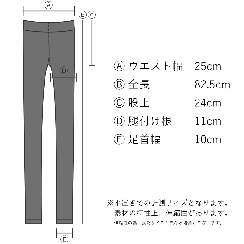 | 平置き寸法 | A:ウエスト幅 | B:全長 | C:股上 | D:腿付け根幅 | E:足首幅 |