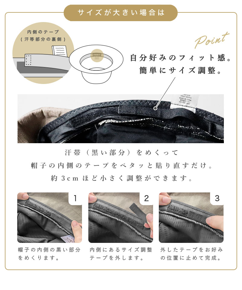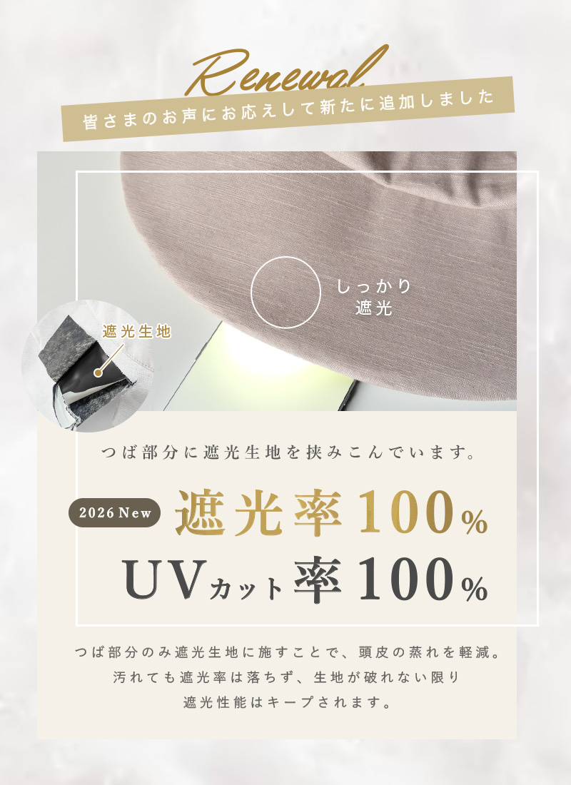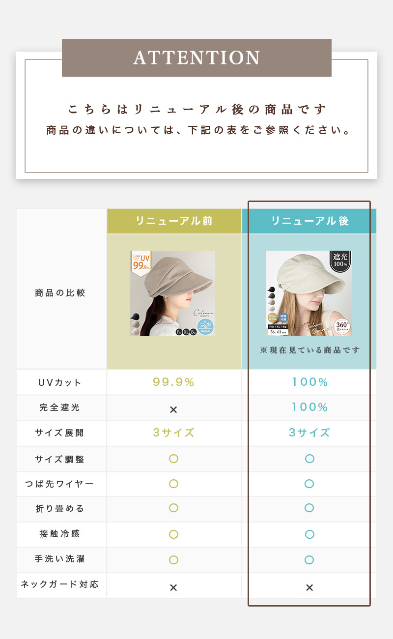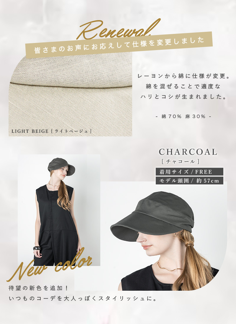 こちらはリニューアルした商品です。 基本的なデザインや仕様に変更はありません。 【接触冷感(裏地・汗帯)】【遮光生地(つば部分)】【素材変更】 上記項目をリニューアルしました。 |