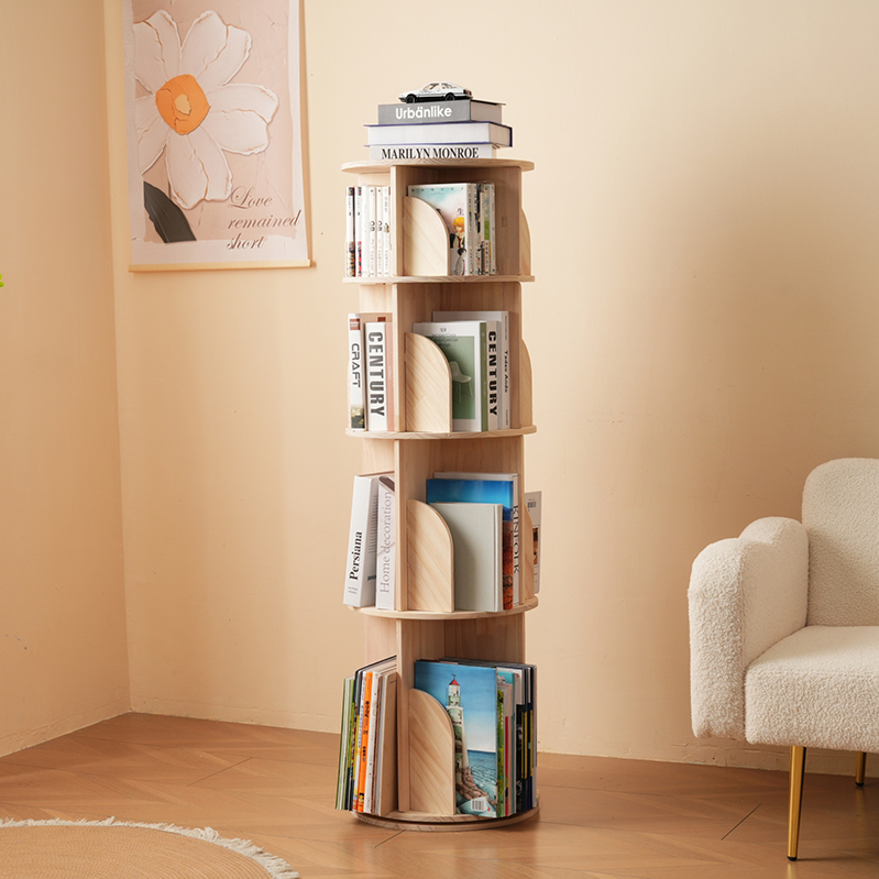 回転式本棚 4段 回転盤-マルチ高さ 天然木 回転式本棚 飾り棚 絵本棚 360°回転本棚 組立簡単 本棚 大容量 回転ラック 組立簡単 省スペース 収納ラック4段