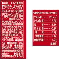 | 原材料名 | きはだまぐろ(インドネシア)、大豆油、辛子めんたいこ、明太調味液、タラコエキス、魚介エキス、酵母エキス、食塩、唐辛子/調味料(アミノ酸等)、増粘剤(加工デンプン、増粘多糖類)、酒精、着色料(パプリカ色素、ベニコウジ色素)、酸化防止剤(V.C)、酸味料、香辛料抽出物、発色剤(亜硝酸Na)、(一部に小麦・大豆・りんご・ゼラチンを含む) |