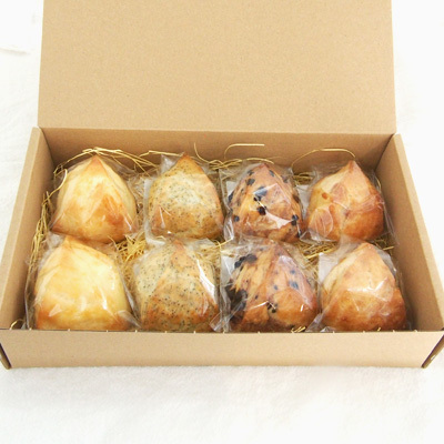 人気のスコーン4種類を2個づつ合計8個を詰め合わせたお得なセットをギフトボックスにお入れしてお送りします。