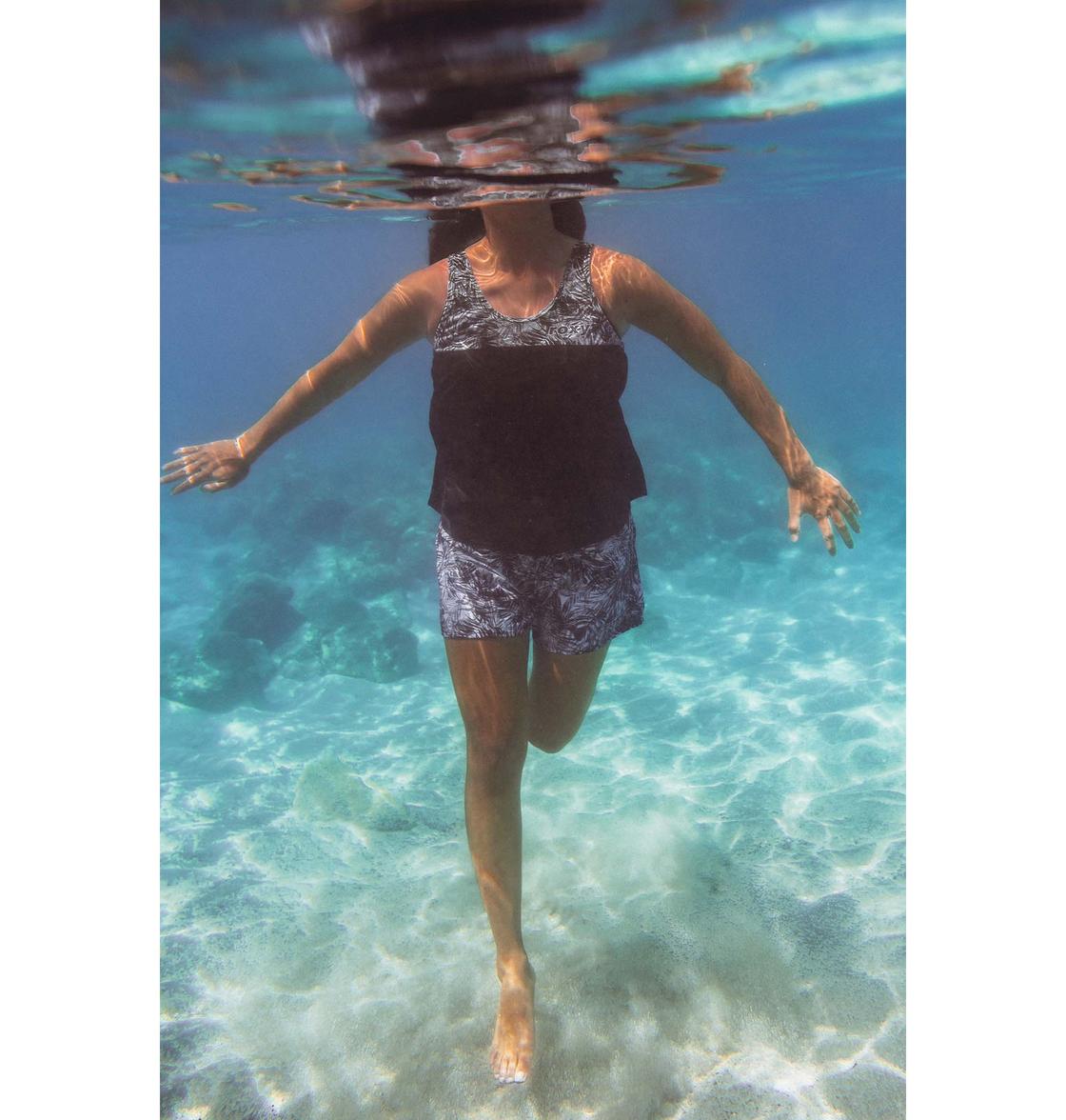 胸元に切り替えをあしらった、2枚仕立てのタンクトップが特徴のセットアップスイムウェア。ピッタリと安心感のあるインナーに、ふんわりしたタンクトップでシルエットをカバー。ボトムは股上深めのキュロットタイプで、ヒップラインをきれいに見せます。ボディーラインが気になる方にも安心の一着です。
